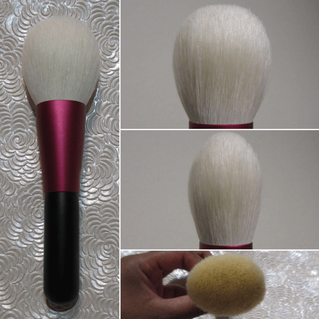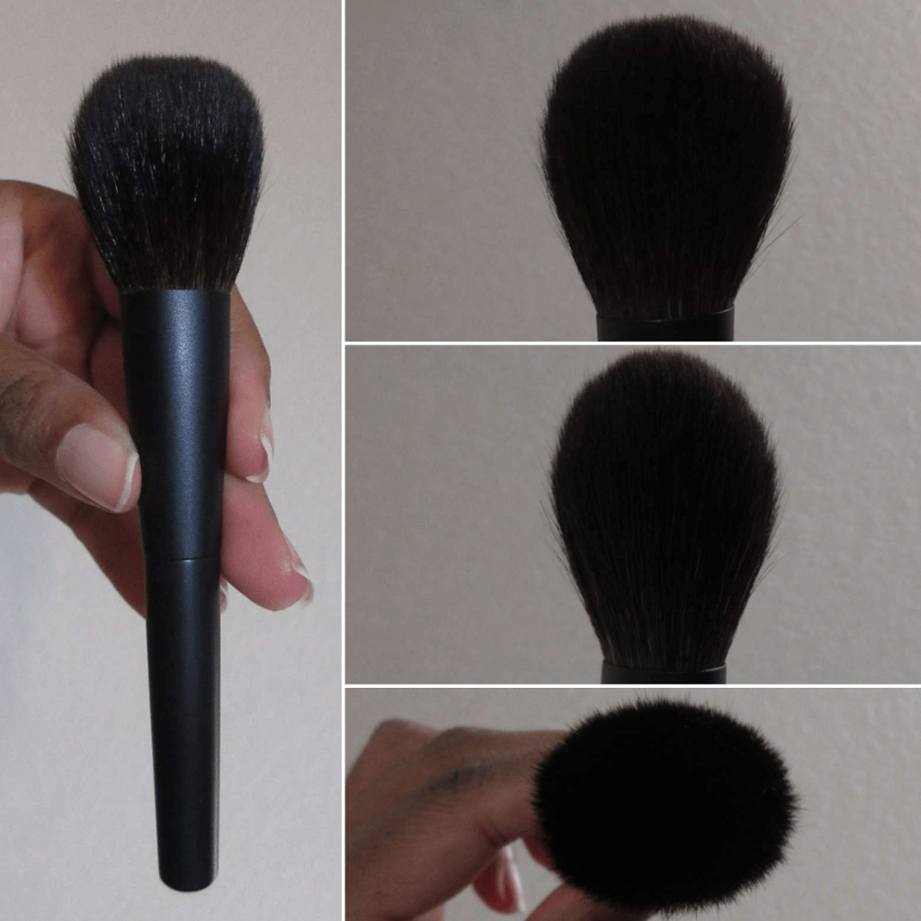 The brush is ovular shaped, not perfectly round. The head tapers to a smaller point so that I can apply bronzer to the perimeter of my face with the tips using short sweeping strokes. However, when I’m using it to apply face powder, I press it down parallel to the pan so that product gets covered on one side, and then I use sweeping motions across the face. This brush has such a wide splay that I lose a bit of control of the placement if I try circular buffing around smaller areas. That’s why I still end up using sweeping or pouncing motions so that the hair moves in the same direction and it gives that soft cushioned feel while I’m applying product. Because I have my favorite powder bronzer brushes already, I use it as intended as an all-over face powder brush. It feels very airy, but it can pick up a sizeable amount of product, so I wouldn’t say this is for someone who wants the barest veil of powder (like someone could get from a squirrel brush). This gives medium pressure buffing and the amount of hair in this brush makes it feel a little more dense and tighter packed than it feels on the skin in practice.