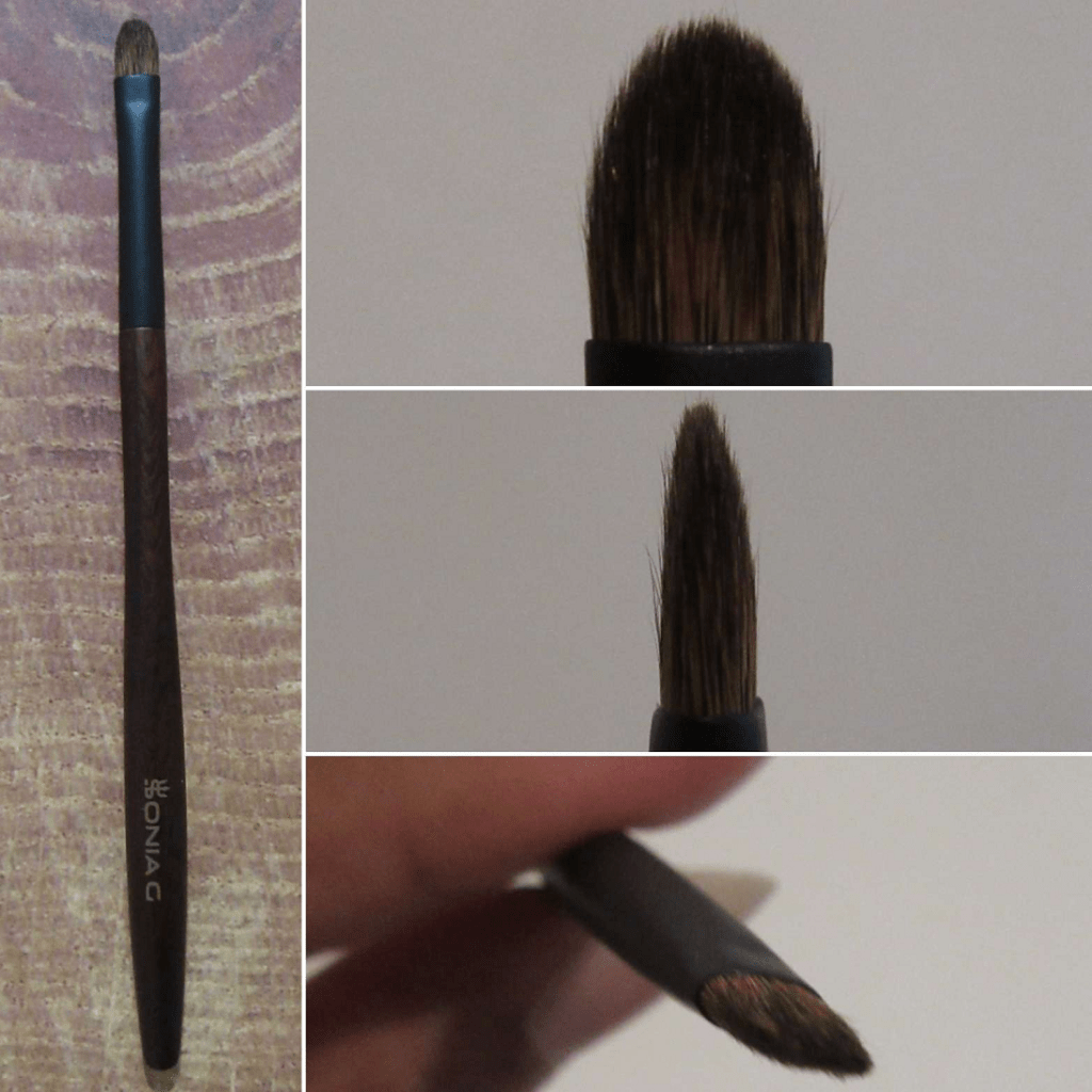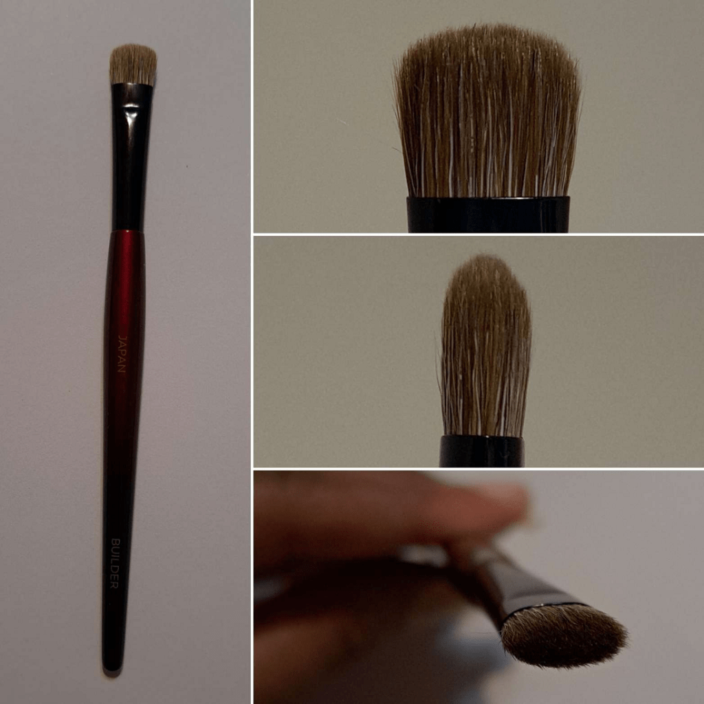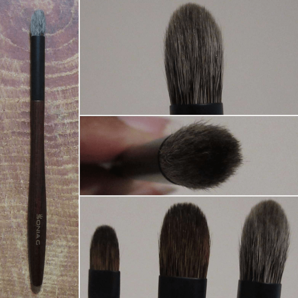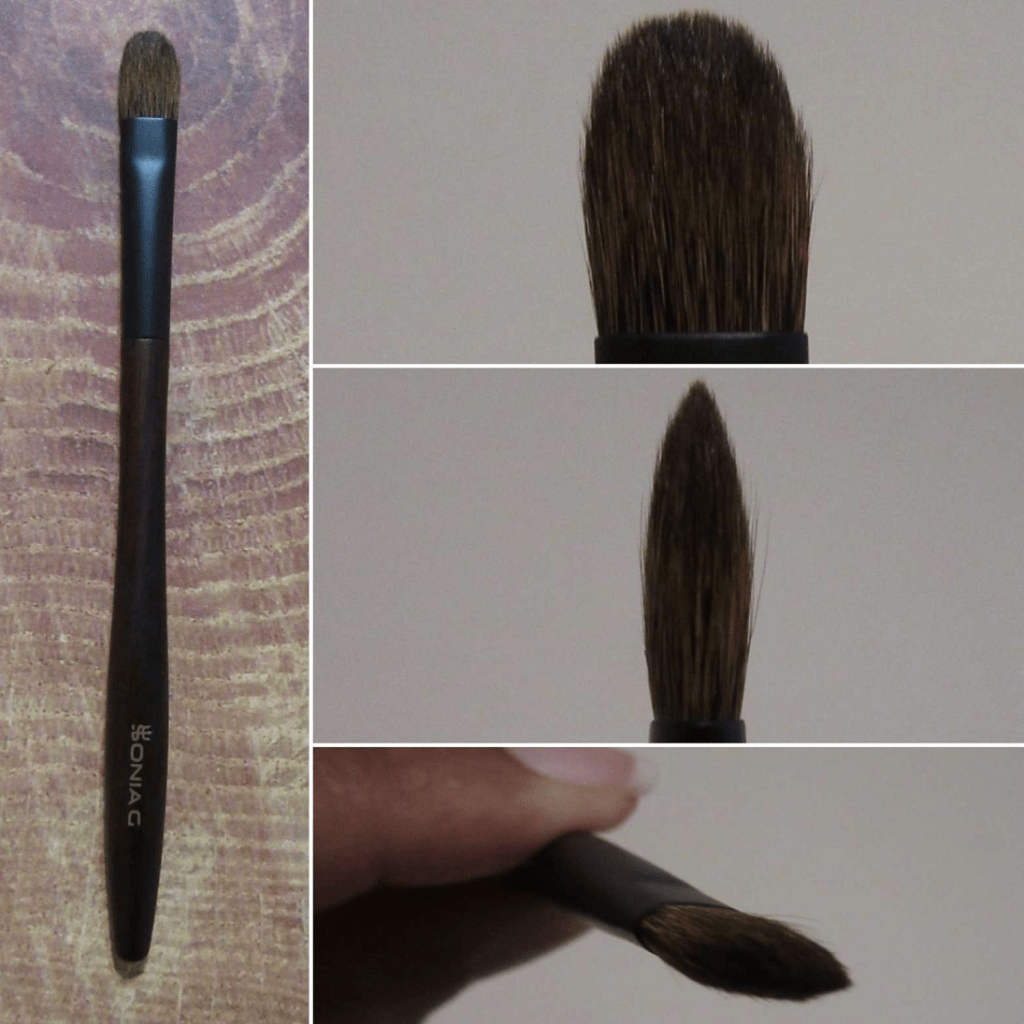 This brush is good for laying down both mattes and shimmers since it has a nice grip on product. It blends out color well for those with larger eye space, is good for applying crease eyeshadow from the tips or when the brush is used turned on its side. It can also be used for targeted highlighting and nose contouring. The point formed by the tips and firmness of the bristles allow me to apply shimmer to my inner corners without needing to switch to a smaller brush. It’s a soft brush, but the tanuki hair might be too abrasive for people with super sensitive eyes. However, it’s still softer Kolinsky, so I don’t think most people will have issues. My brushes closest to this shape are better for building up color gradually, so it’s nice to have an option that’ll pick up firmer pressed products and deposit it more heavily if I want to build eyeshadow quicker.
