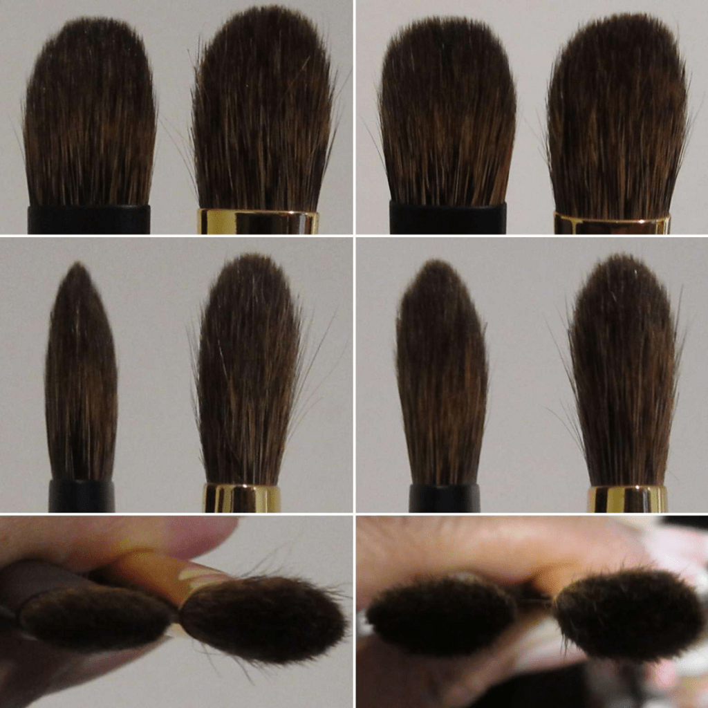Regarding my measurements, “hair width” is measured from the widest part, regardless of the overall brush shape. I don’t measure thickness. Anything with an asterisk indicates that I had to measure that one myself as those numbers were not listed on the website. All figures listed in inches are converted estimates.