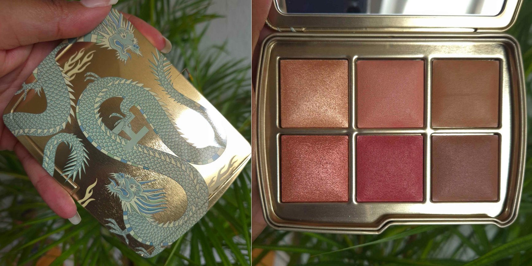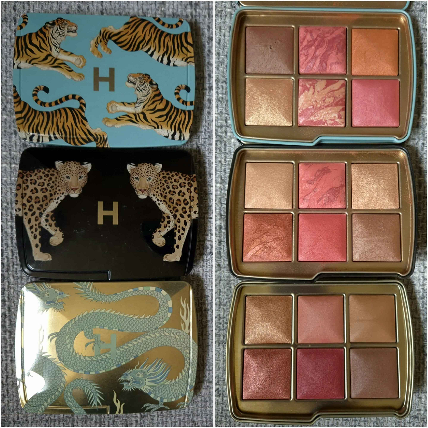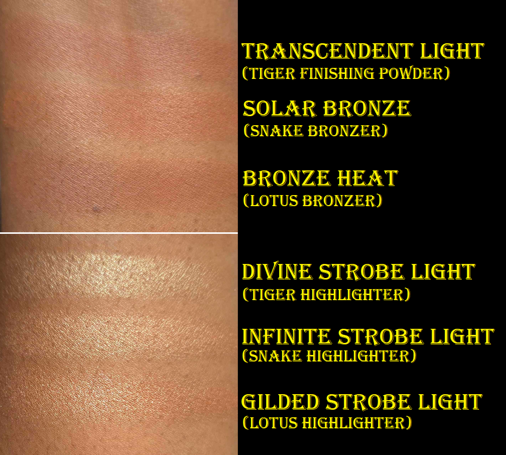 I don’t have access to my full Hourglass collection, so I could only compare things to my Tiger-Butterfly custom hybrid palette, the Snake palette (in Leopard packaging), and Lotus (in Dragon packaging). This year’s deep blushes are finally distinctly different from each other, and previous years. The highlighters and bronzers are super similar though, with just slight undertone differences.