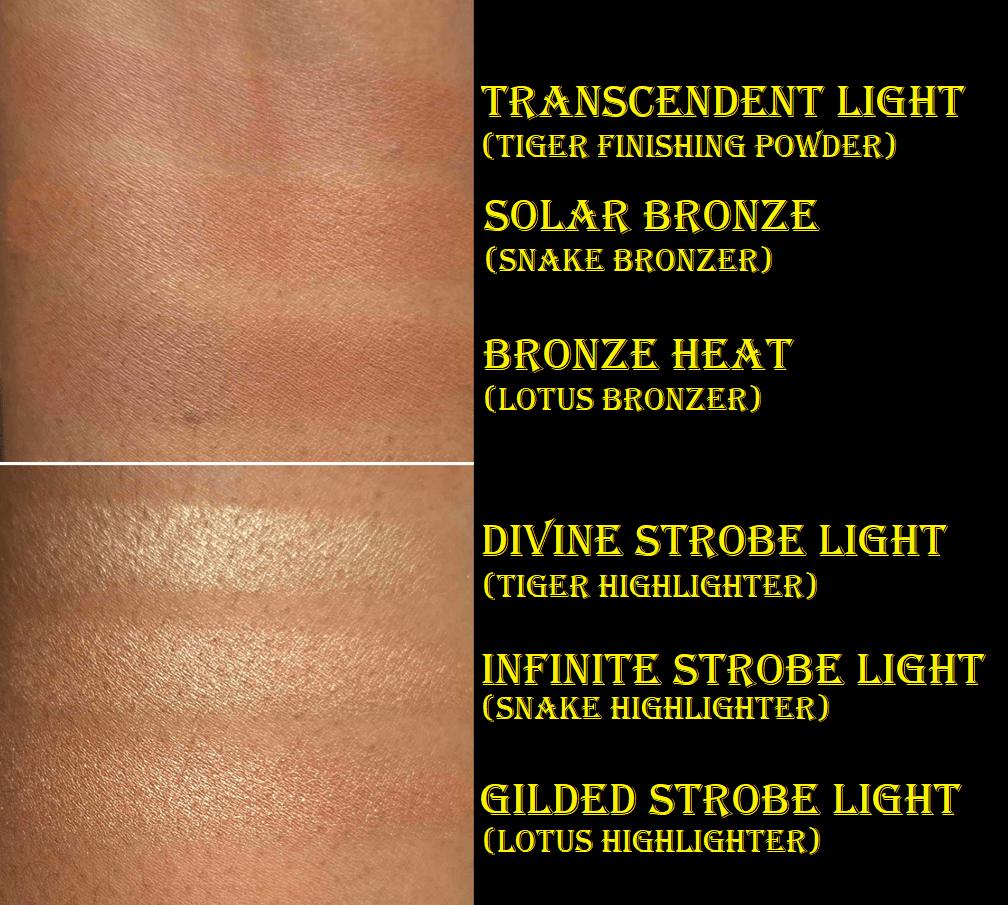ETERNAL LIGHT – I’m going to repeat what I said about Eternal Light from a previous review. This finishing powder is a golden brown color that matches my face perfectly! It gives a subtle luminous sheen, but also has a few flecks of gold glitter throughout. The difference this time, in the Lotus Palette, is that the larger gold specks seem to be way smaller than they are in the Volume III trio palette. In the past, the specks forced me to use it as either a mixer shade with bronzer or as a barely there highlighter. I’m thrilled I can actually use this shade as a setting powder now! I don’t know if it’s just my palette, or if all Eternal Light shades are now made with more refined shimmer.