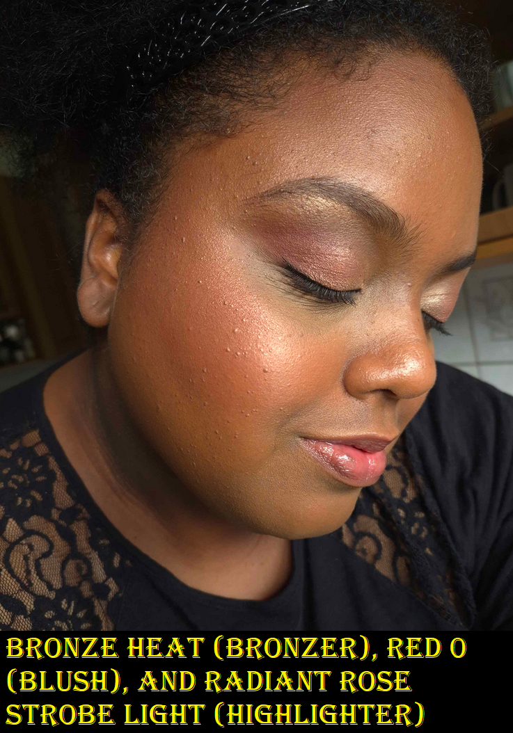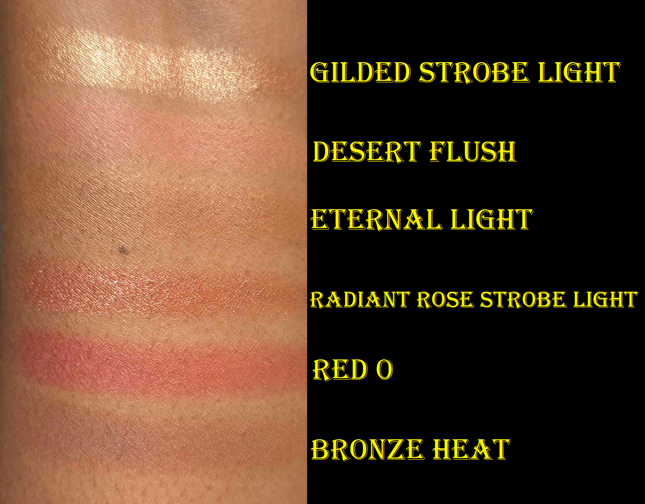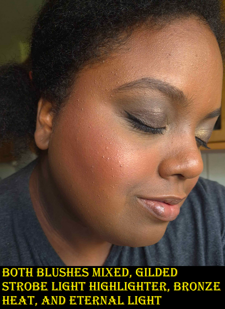 RADIANT ROSE STROBE LIGHT – I normally don’t like pink highlighters, but this is actually pretty! It pairs so beautifully with the Red 0 blush. When used sparingly, this looks a bit gold too (or at least golden copper). I had to actually build up the color in my face demo photo for the rose tone to be clearly visible, which of course increased the emphasis on texture. Contrary to how it appears in my photos below, the reflectivity of this shade isn’t as strong as Gilded Strobe Light when used in smaller amounts. I like that part about it.