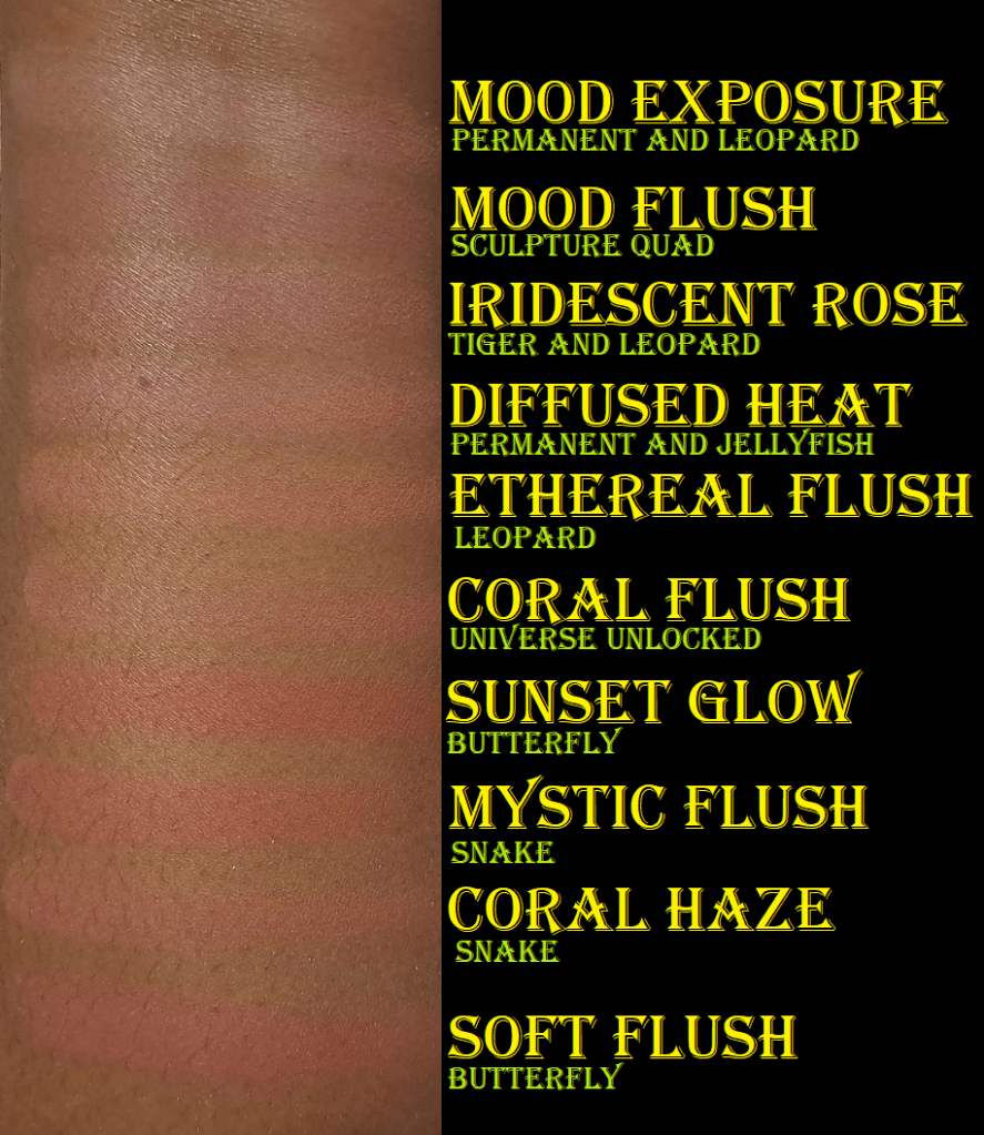 I put At Night as the perfect blush, but I also really like Diffused Heat (with more of the colored marbling), Mood Flush, Mood Exposure (to tone down vibrant blushes), and Sunset Glow more than the rest.
