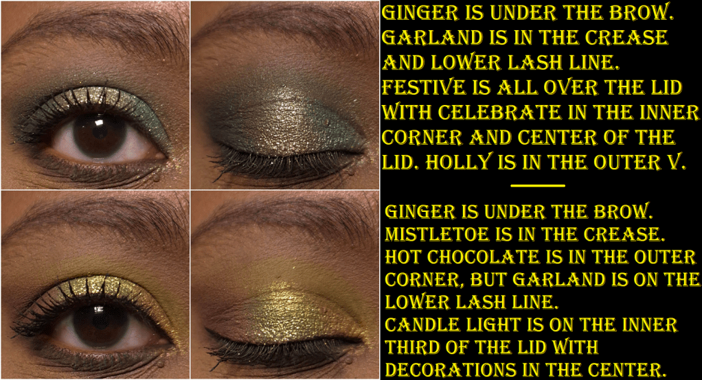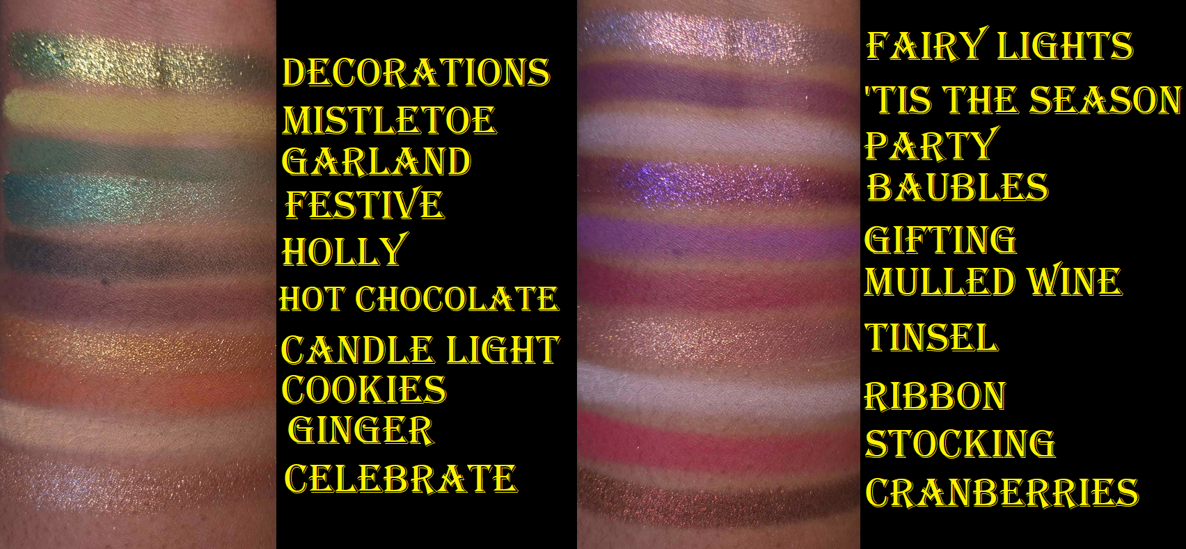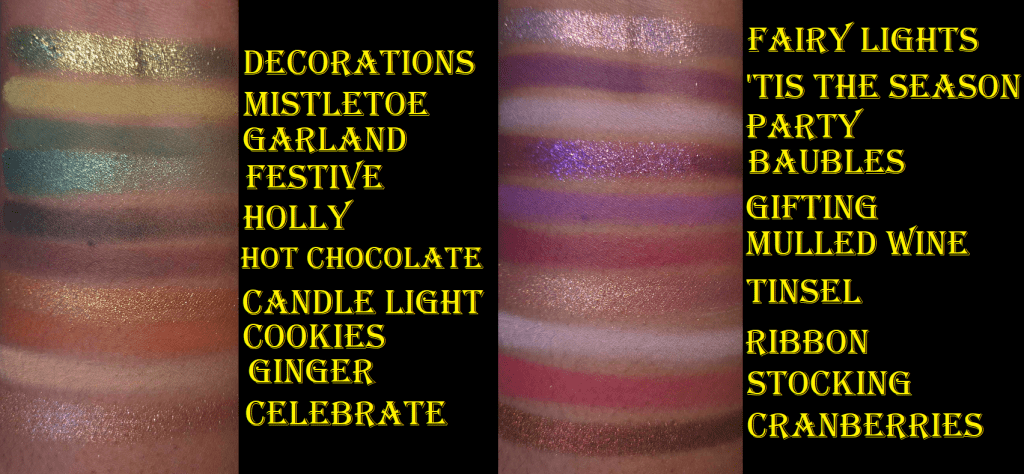 Regarding the shimmer formula, I’m pleased that they have the kind of impact I expect from an indie brand. There’s no need to spray my brush in order to intensify the shine, but a shade like Baubles is on the flakier side and could benefit from a damp brush to minimize the fallout. Candle Light and Fairy Lights are a bit thick, but smooth out across the eyelid nicely. Decorations is also chunky, but the wettest of all the shadows is Celebrate.
