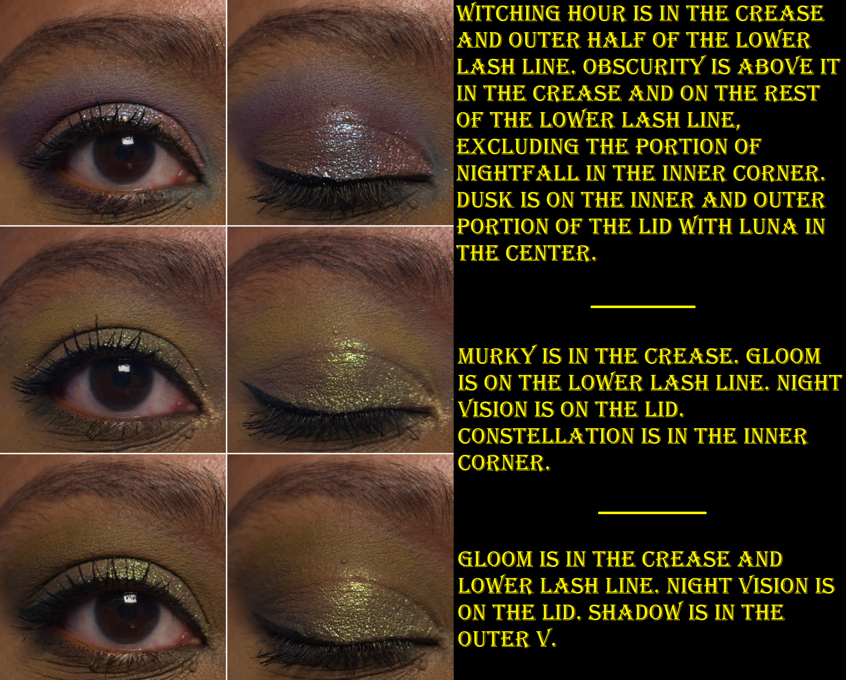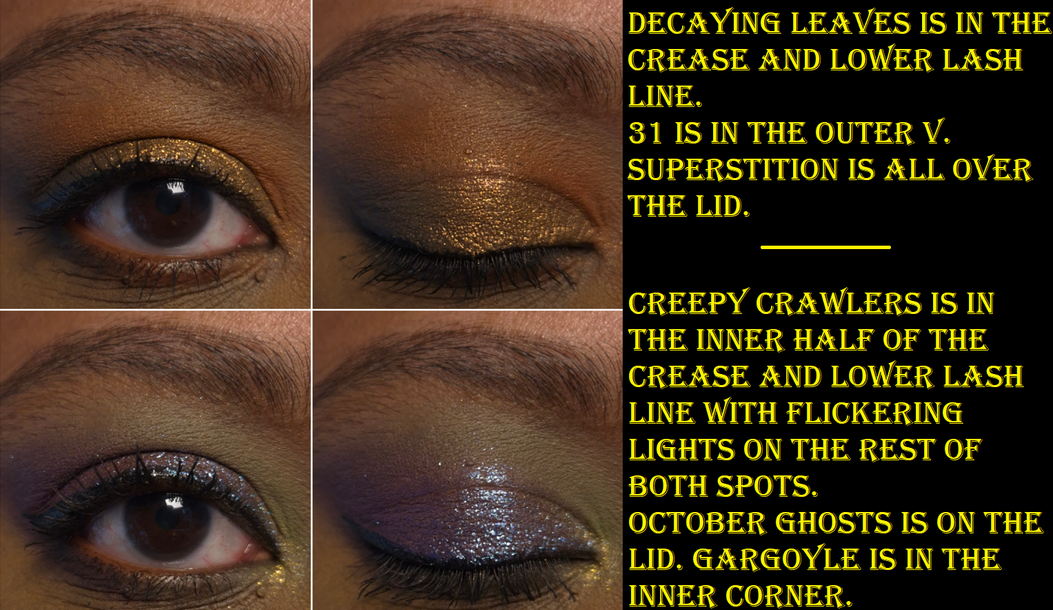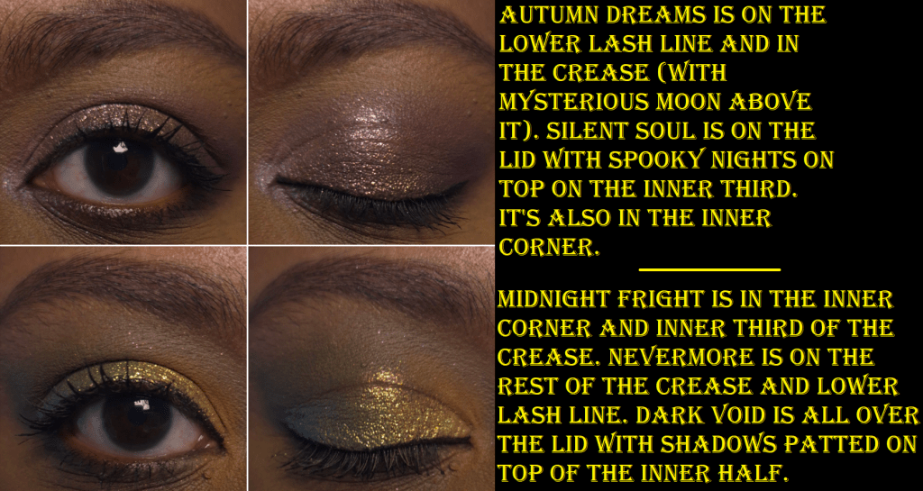 The important thing to note about specific shades is that Creepy Crawlers and Nevermore look very similar on my eyes when used together, but it can’t compete with the twin-ness of Flickering Lights and Autumn Dreams.