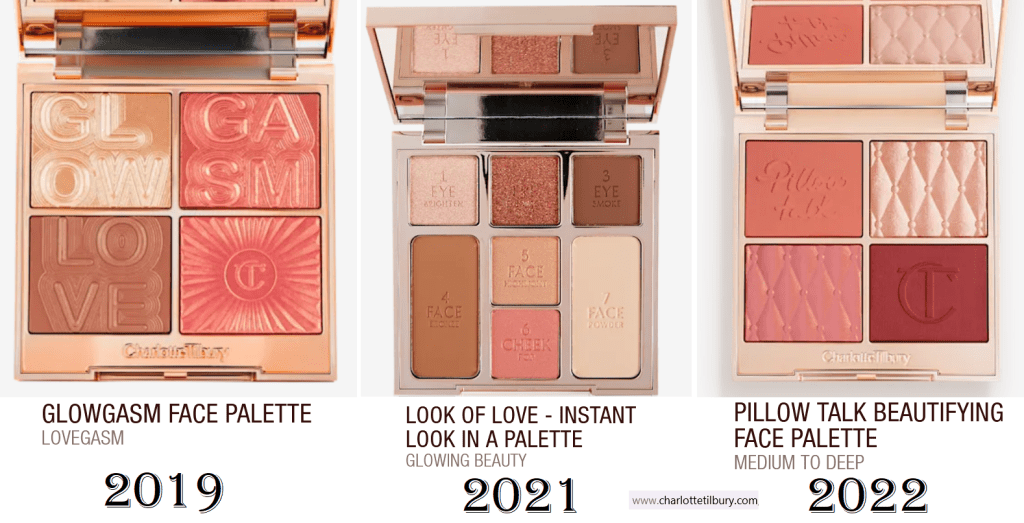 Before we start the review, I’d like to highlight the fact that Charlotte Tilbury used to have annual face palette launches, but they were usually not deep-skin friendly. The photos below are of the three darkest palettes the brand created until this year. I didn’t end up buying the one on the left because of how light it looked on tan reviewers I saw on YouTube. I didn’t get the one in the middle because I feared none of the cheek products would work on my skintone, especially since I was darker in 2021. I didn’t buy the one on the right because I rarely reach for blush and highlighter palettes. A face palette doesn’t feel complete to me without at least a blush, bronzer, and highlighter together.