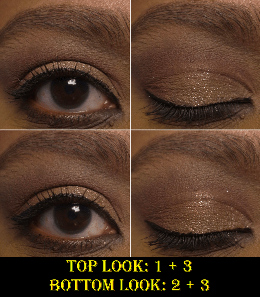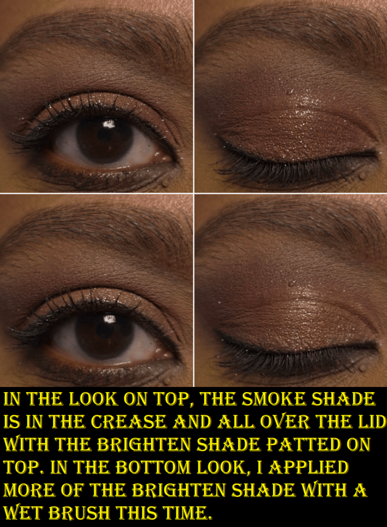Starting with the eyeshadows, the 1 Brighten shade is described as a warm tan with silver shimmer. On my skin tone, the tan color is only visible if I apply it wet (as seen in the photo above), and technically on top of a darker shadow. So, if I just tap it on top of my lids without dampening it, only the silver particles show in a scattered-effect-topper kind of way.