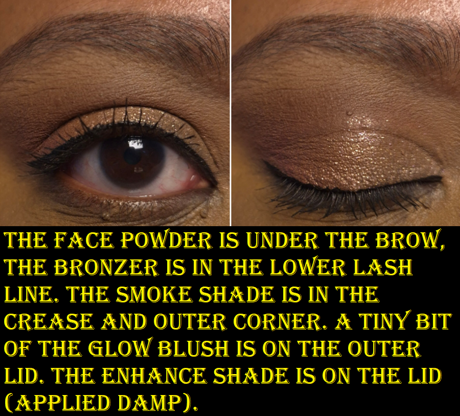 So, if I include the brown bronzer as a blending out or softening shade, the face powder as a brightening shade, the raspberry-pink matte blush and shimmery glow blush as ways to intensify the pink elements of eye looks, the Smoke shade for dimension, and I use the two shimmers damp, I’m content enough with the variety of pink and purple eye looks I can create.