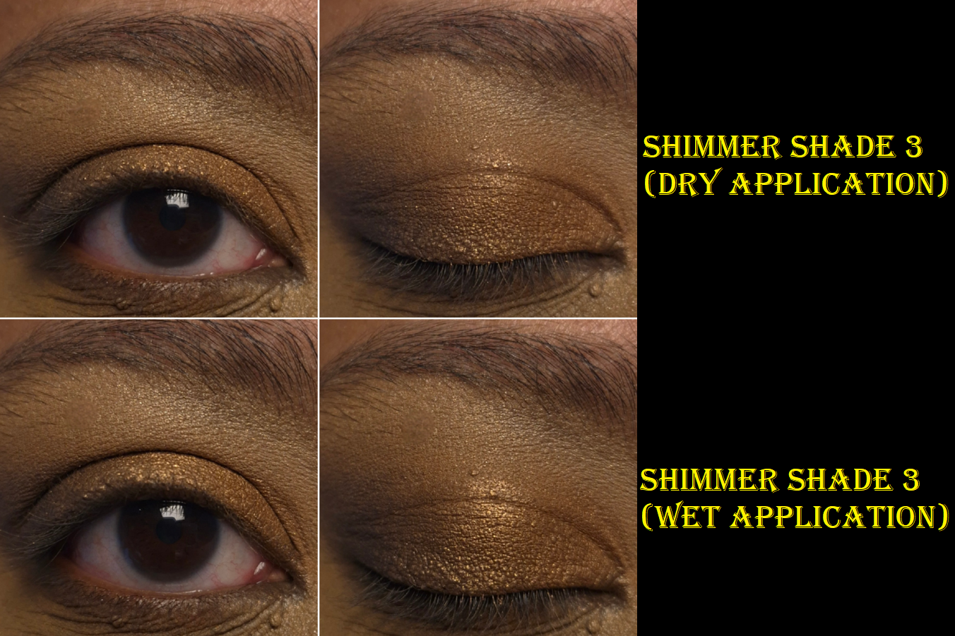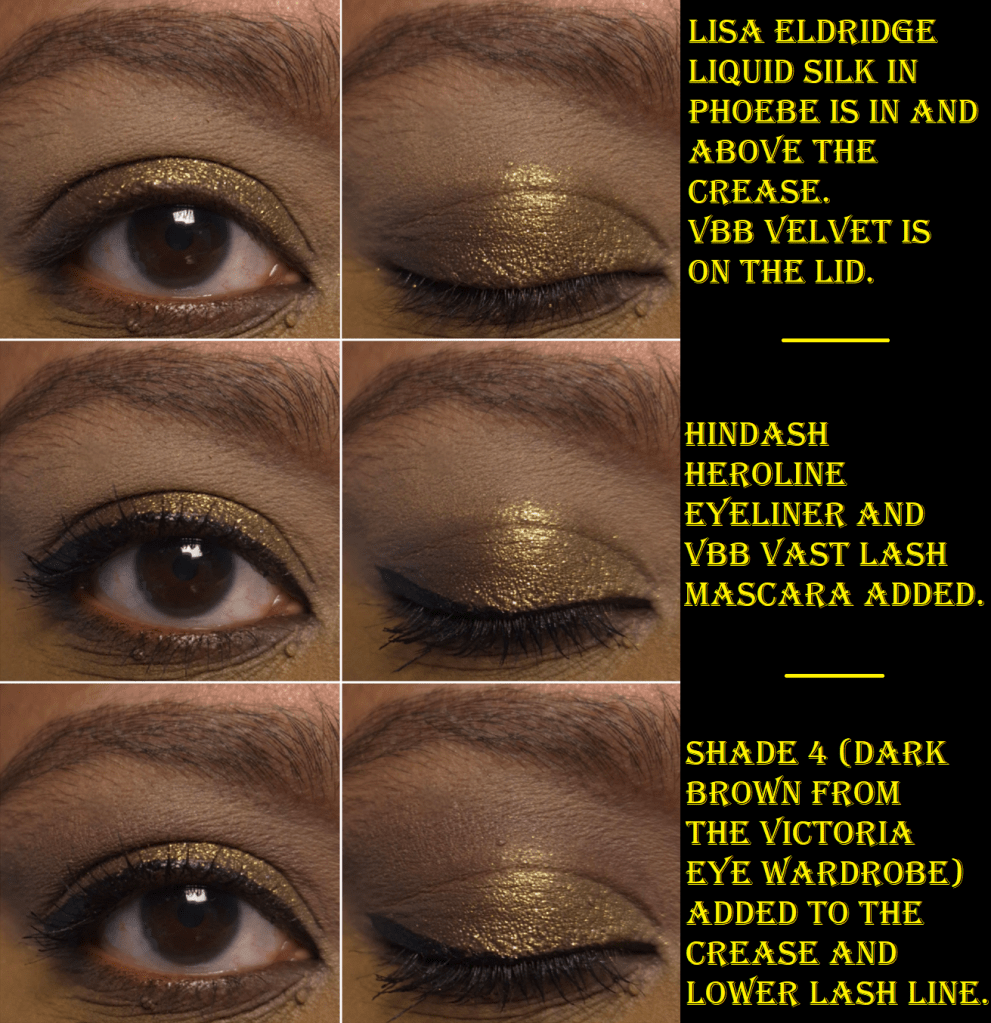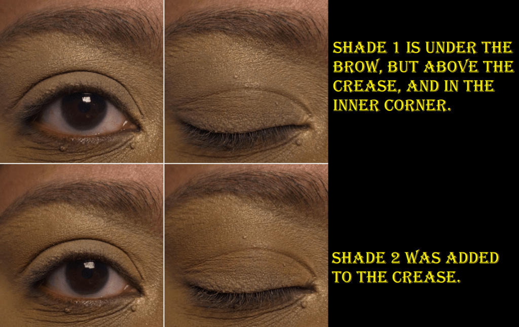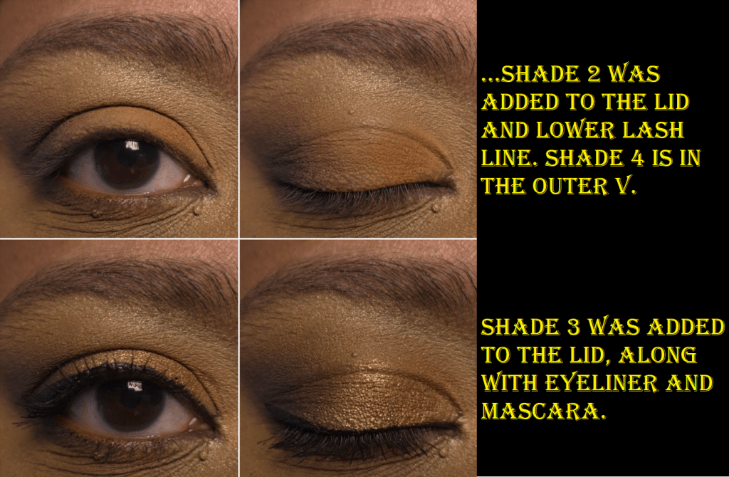 This may have just been an issue in the beginning of the testing process because some of my recent looks have been more to my preference. I guess I just needed to use the quad enough times to dig those shimmer particles out of the pan and onto my eyes. Granted, Cocoa is still smoother and drier than the Victoria shimmer by comparison, and since it’s a dark gold on top of a medium-dark bronze, the sparkles don’t stand out quite as much as silver on a blackened taupe.