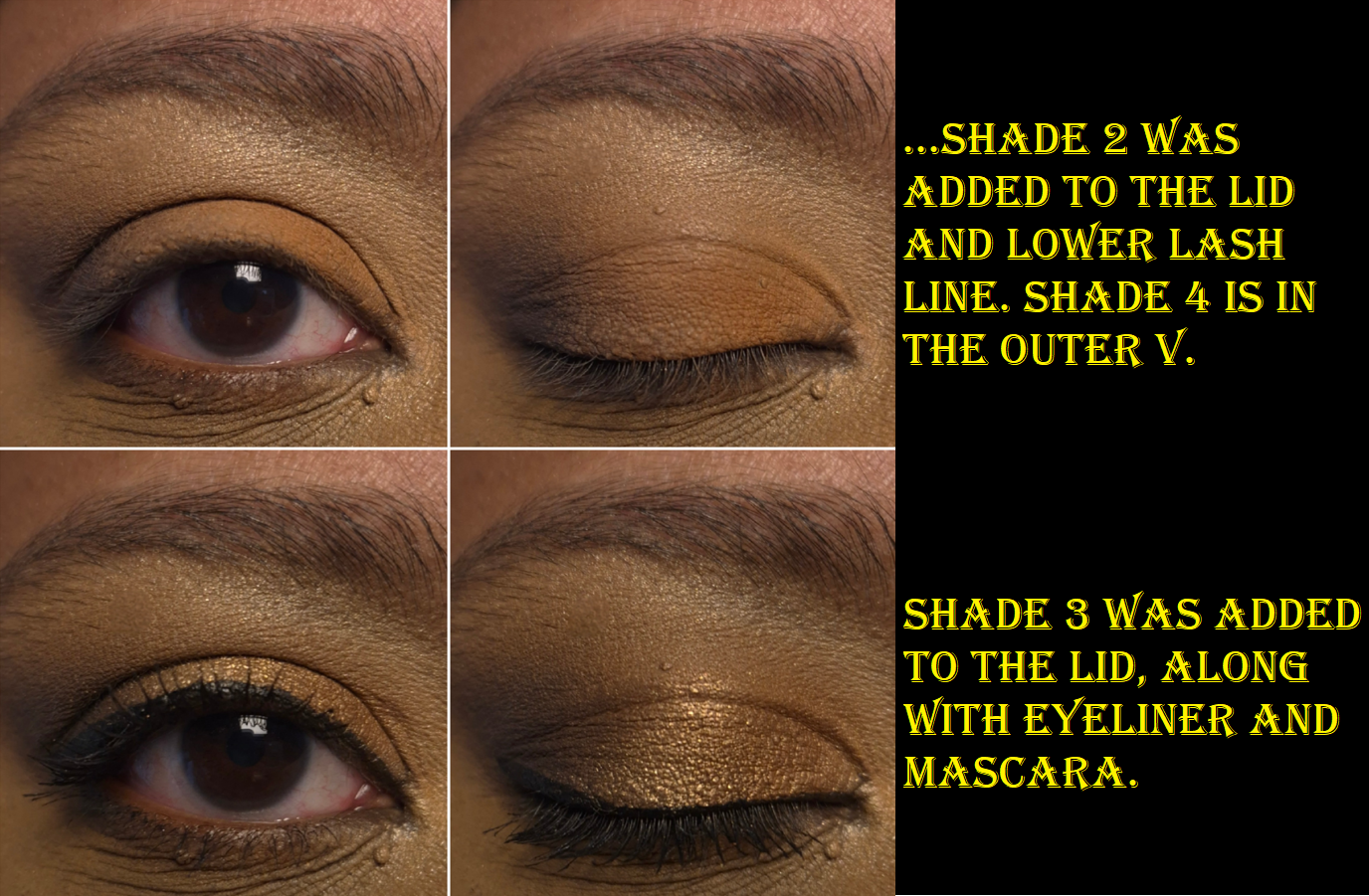 The photos above and below are the 4 steps to creating a single eye look. I wanted to show the process because of how easy it is for Shade 1 and 2 to get lost in the overall look.
