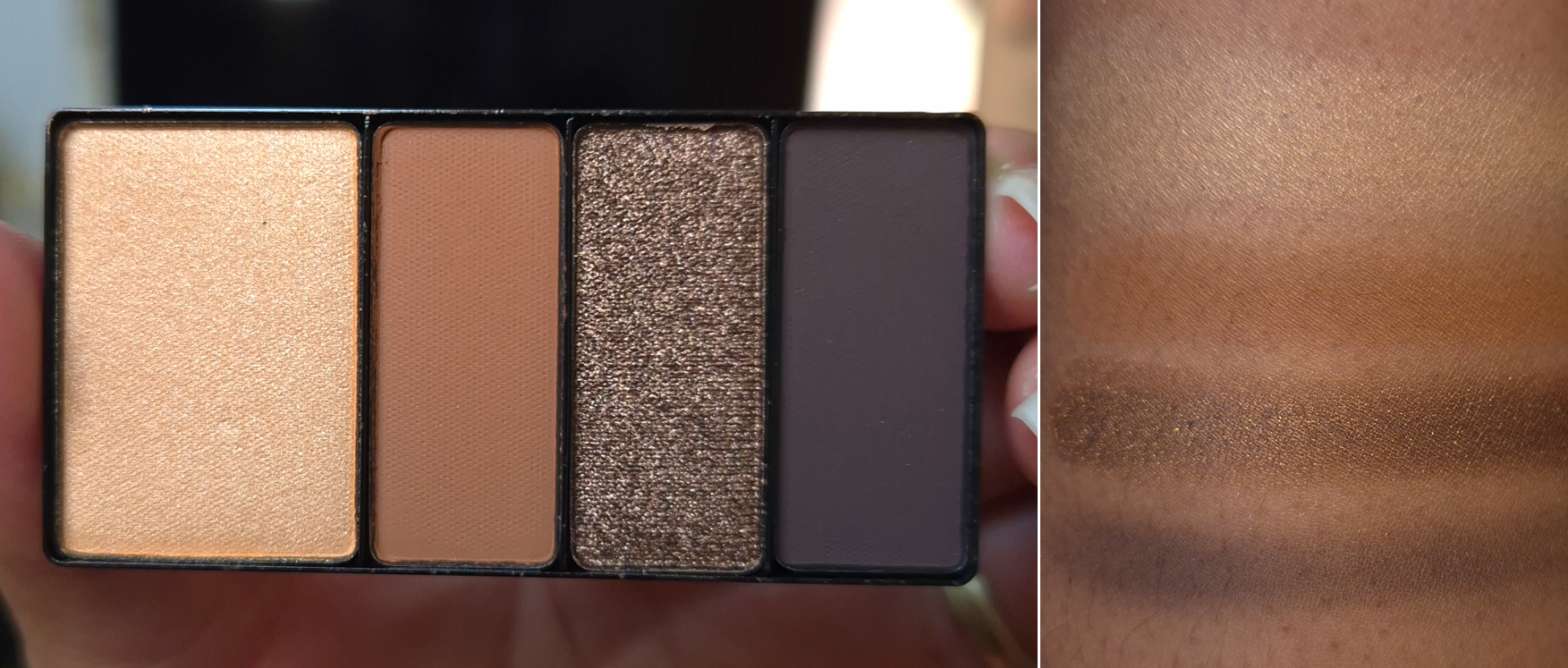 Shade 2 looks super warm when applied heavily, but if I’m just using a normal amount, it doesn’t look as bold. If I blend it out too much, it doesn’t stand out enough on my skin tone. That’s just the nature of having brown skin with a warm undertone, then trying to add a warm brown eyeshadow on top that isn’t too different in depth! So, I try my best to pack this shade on, and I’m glad that it’s buildable.