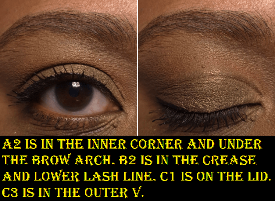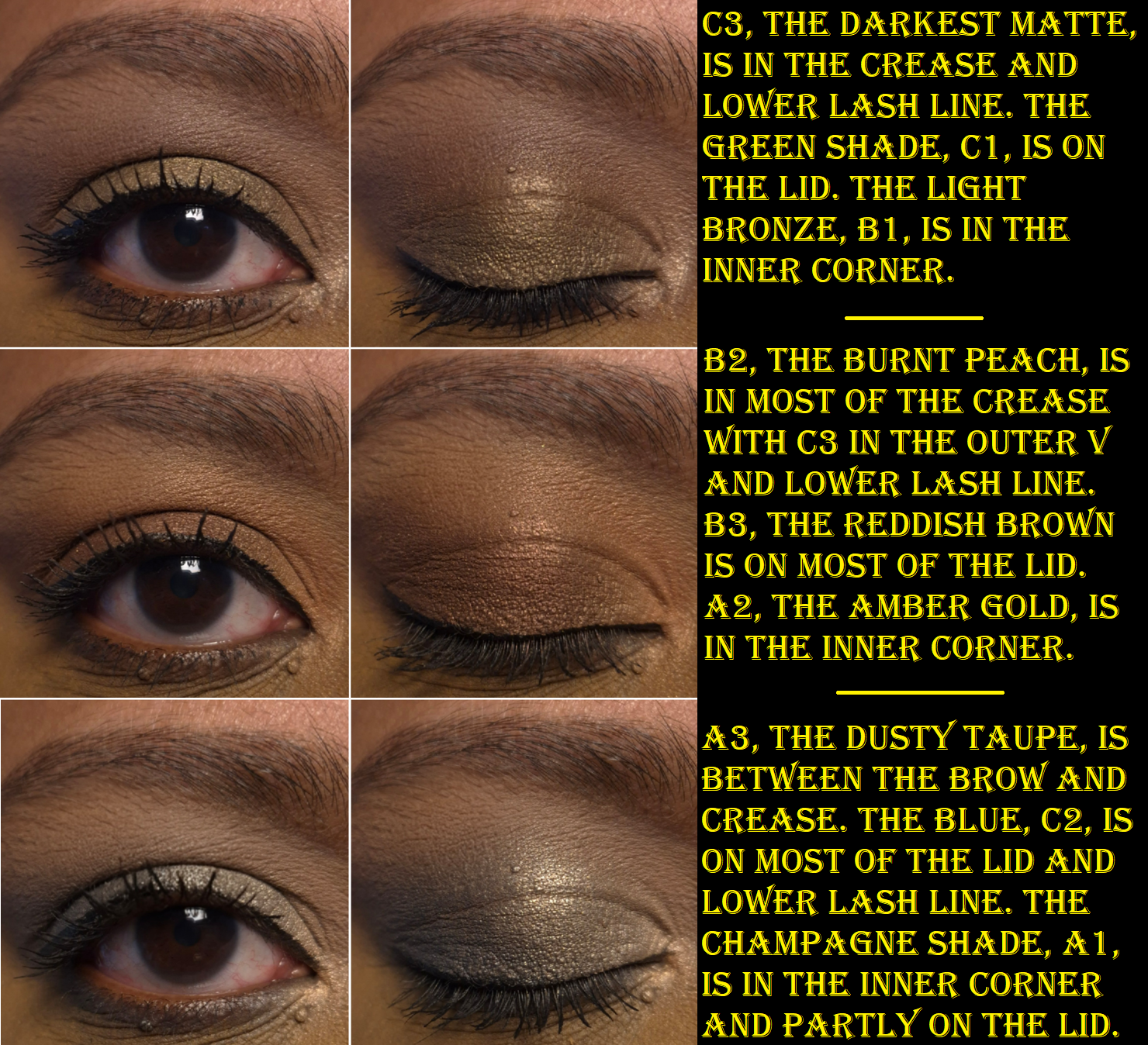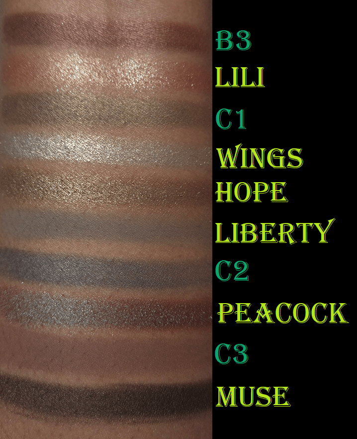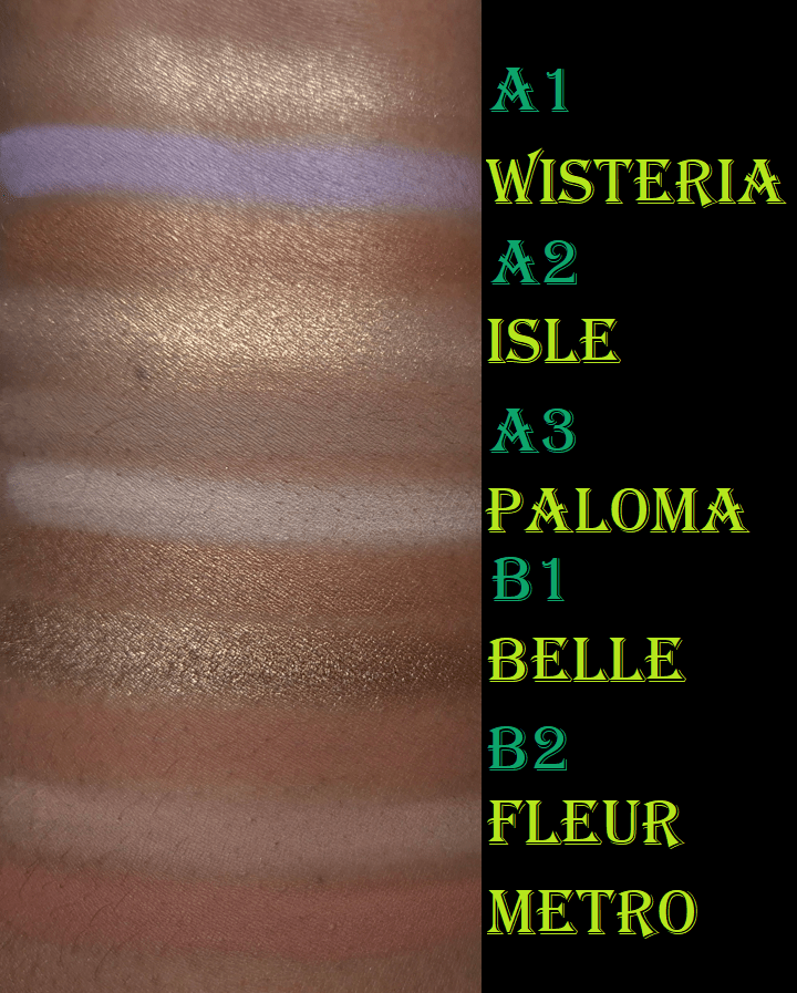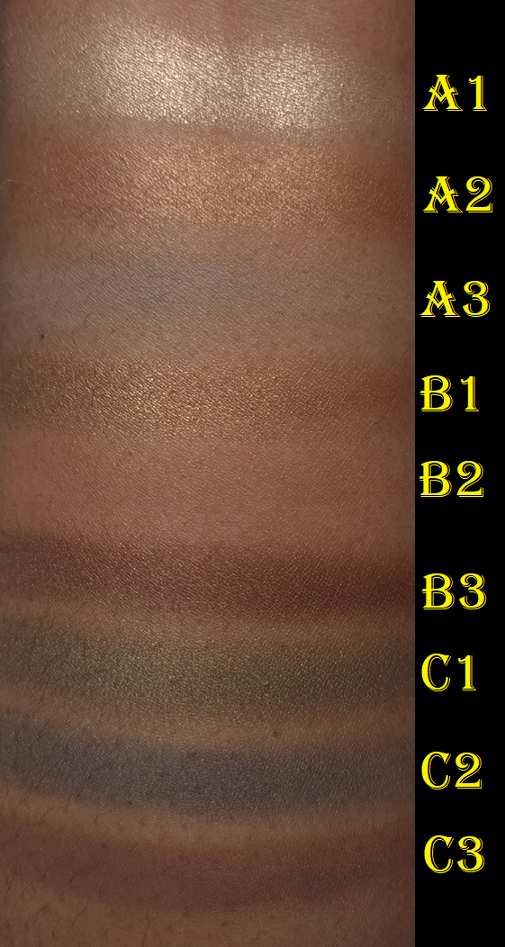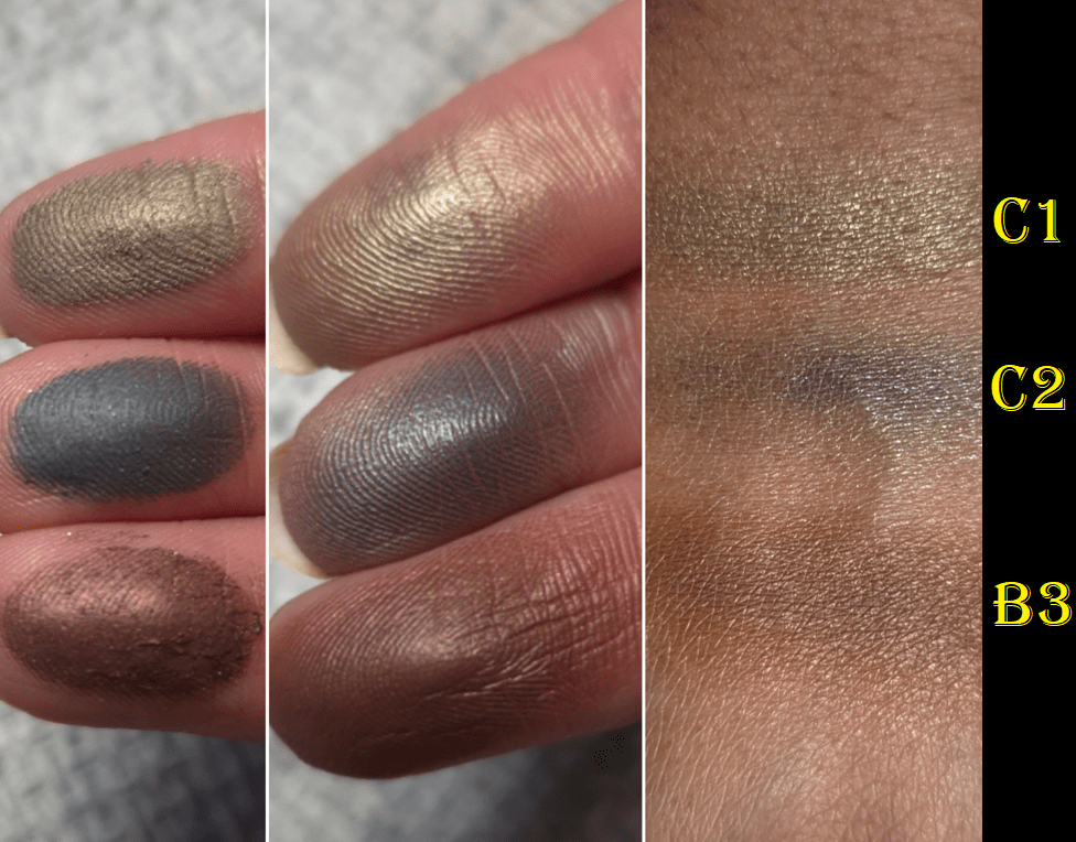 A1, A2, and B1 are the inner corner type of shades, which I’m satisfied with. C1, C2, and B3 are the visual standouts, but they have a sooty quality to them that I can easily see when I rub them into my skin. I’ve seen this kind of effect from multichromes, duochromes, and sparkly formulas to look even more intense. With the type of finish these have, I feel like these colors veer away from the muted category and closer to dull. I wish these had more of a wet metallic finish instead.
