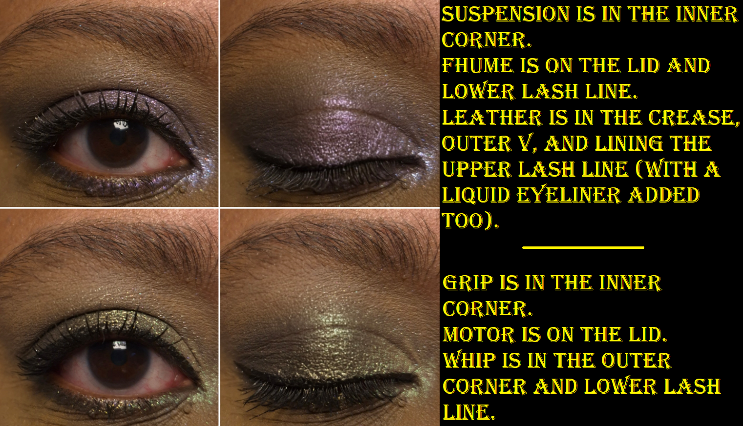 I’m the most confused by the description of Suspension as a, “plum with soft gold shimmer,” when it looks purely silvery to me. Perhaps they mean white gold? It’s a bit thicker of an eyeshadow and grittier. I definitely need to wet this or use glitter glue. It’s one of the most glittery shades in this palette and contains slightly larger shimmer particles than the others. Even though it has a dark base, that reflect is so sparkly and bright that I can use it like a highlighting shade to amp up the overall bling level of the eye look. I’ve tried using it in the outer corner and utterly failed to create depth there.