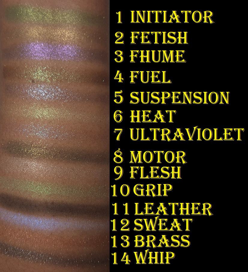 Brass is a shimmery orange-red color that looks like it’s going to be richly pigmented from how it appears in the pan, but it’s another medium opacity type of shade. I use it in a similar way as Fetish, which is to be a transition eyeshadow. Its texture is similar to Initiator and less powdery than Fetish.