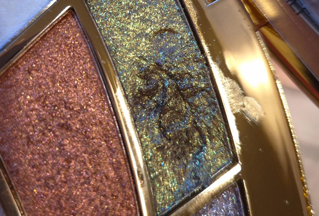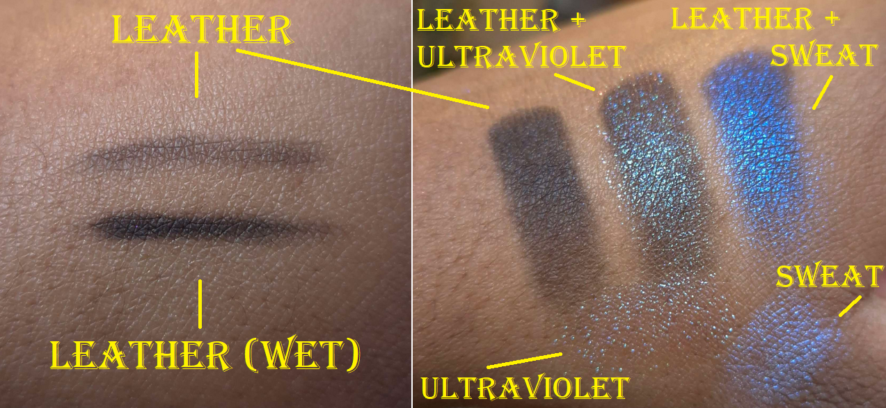 Some of the sparkles from Ultraviolet and/or Sweat have gotten into my pan of Leather, but I haven’t noticed it effecting other looks. Those shimmer particles don’t seem to transfer easily back out.