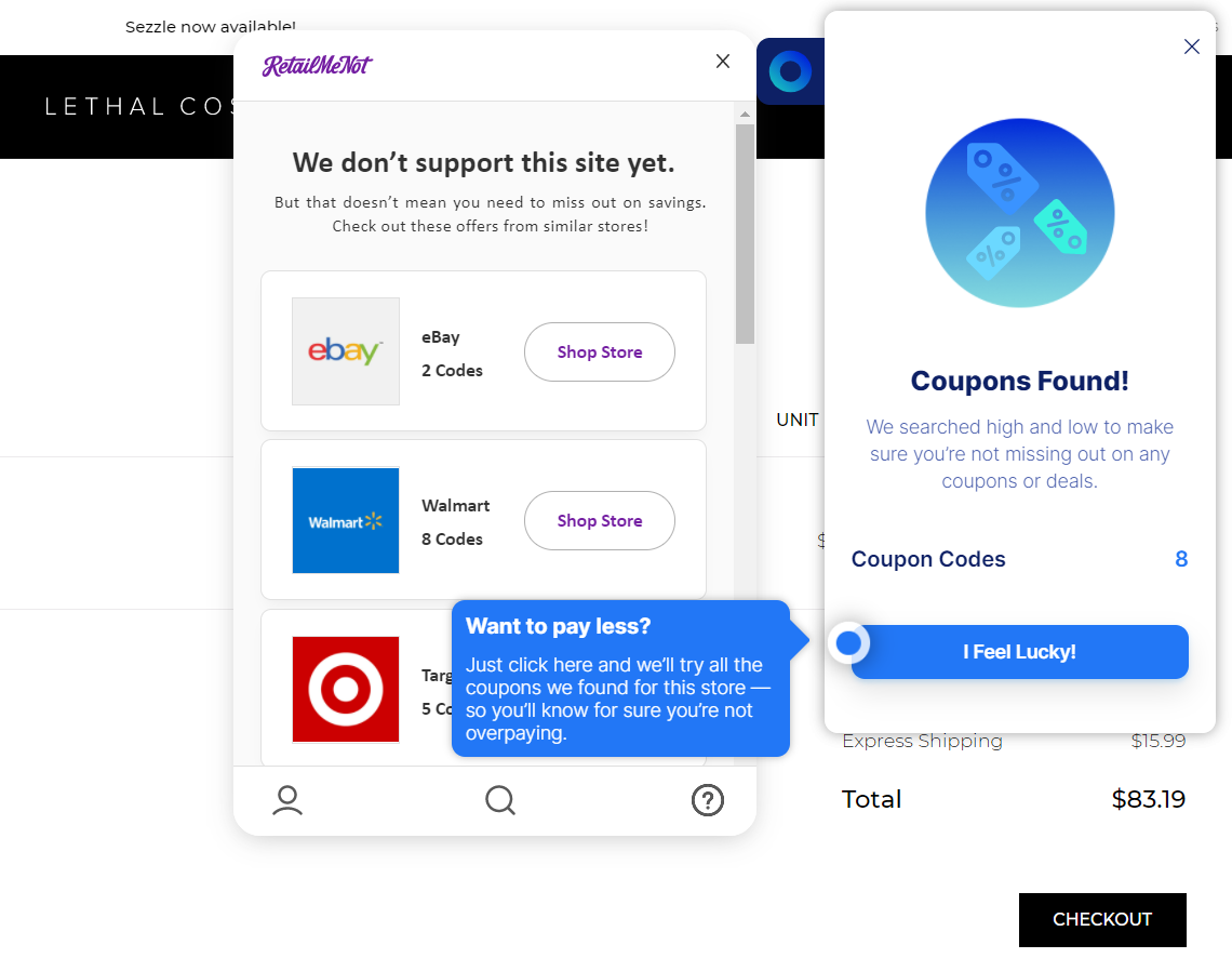 RetailmeNot is a promo code browser extension/website like Honey and Karma (Karma was previously named Shoptagr) that cycles through their list of company and user submitted promo codes to check if you can save any additional money off your purchase and/or if there is a better promo code than whatever you entered on the website.