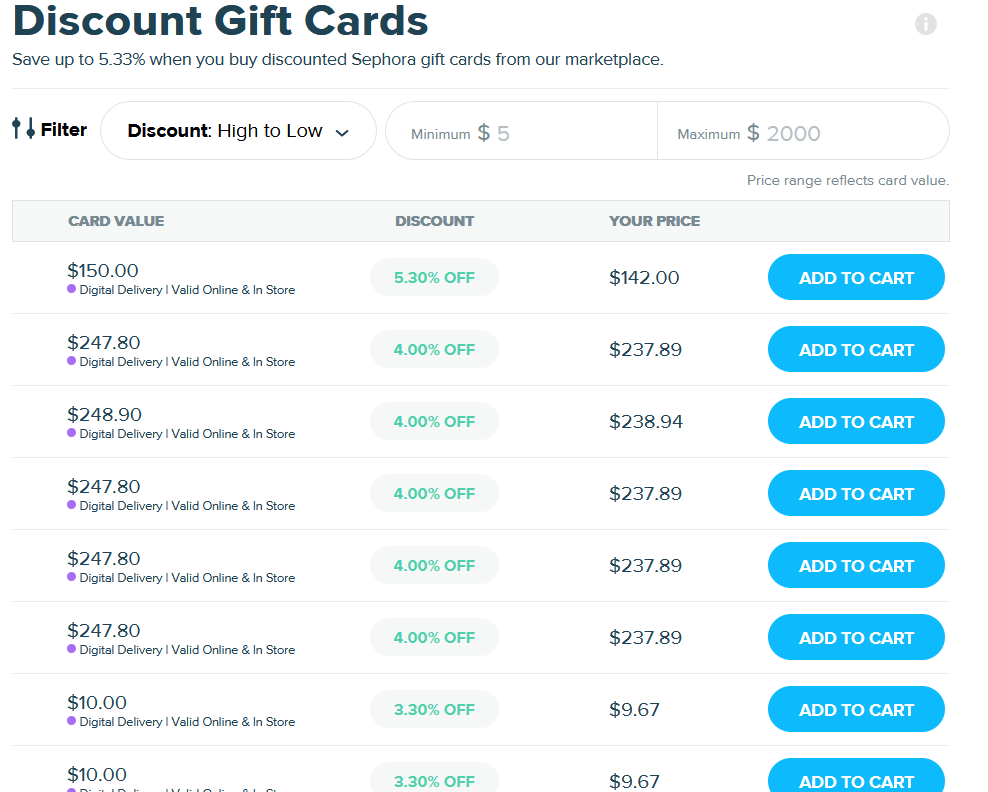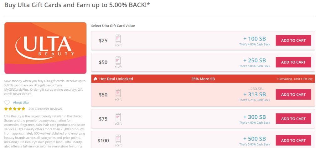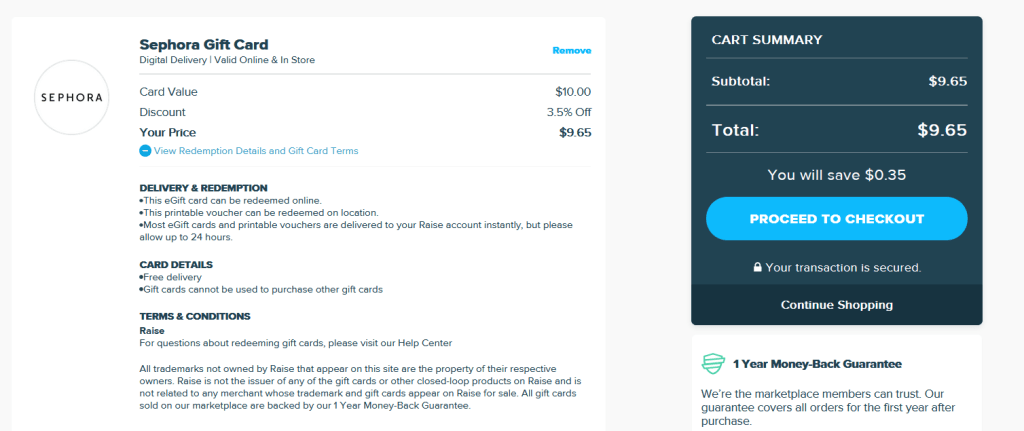 According to my Raise history, I’ve saved $211.31 to date. It may only be a few dollars off at a time, but it adds up. Periodically, Raise will release promo codes that knock an additional 5 or more percent off a Raise purchase. So, that 20% discount from one seller could turn into 25% off with a promo code. There are other kinds of deals that Raise offers, such as Raise Cash, but that gets a little more complicated and it’s best to learn about those avenues directly from them. Also, I believe all Sephora and Ulta cards are for electronic delivery, but Raise also offers physical cards for stores that only allow gift cards for in-store purchases, so always check that before paying.