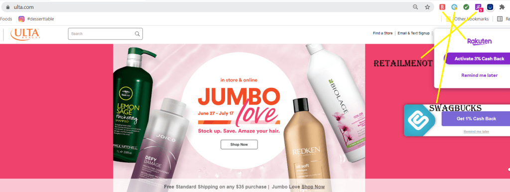 So, how it works is if I go on any website belonging to an affiliate of Rakuten, the browser extension will notify me. I just click to activate cash back and it will redirect the page. I know it worked when the icon becomes blue and says it’s activated. With Swagbucks, the symbol with a yellow circle turns into a green circle. You cannot have more than one cashback site activated at a time. The browser extensions also show promo codes that can be used at checkout, as well as list different products on sale. Raise is actually affiliated with Rakuten (and sometimes Swagbucks), so you can get a little cashback (I’ve only ever seen 1%) when buying a gift card from Raise!