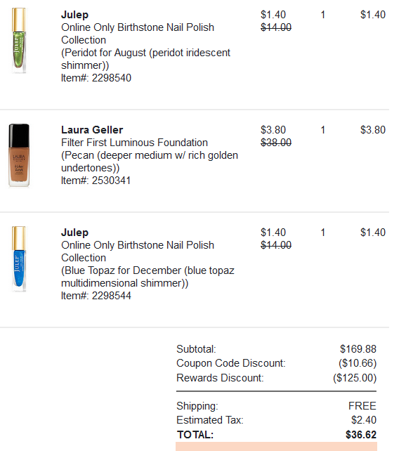 The absolute ultimate money savings combo is when I buy a discounted gift card, activate cashback, use a promo code for additional savings, and top it all off with an additional price deduction when using a company’s reward program. Plus, if you get cashback or rewards automatically on your credit card purchases via your credit card company, that’s an extra win! This has happened to me a few times, though I can’t remember which orders were the best ones at the top of my head, but here is an example. Some of the products in my order were deeply discounted because Ulta wasn’t going to carry them anymore, plus I used a promo code, I activated cashback, and I redeemed 2000 points. I paid about $36 for $170 worth of products at the sale price, not even including what the total would be at full retail.