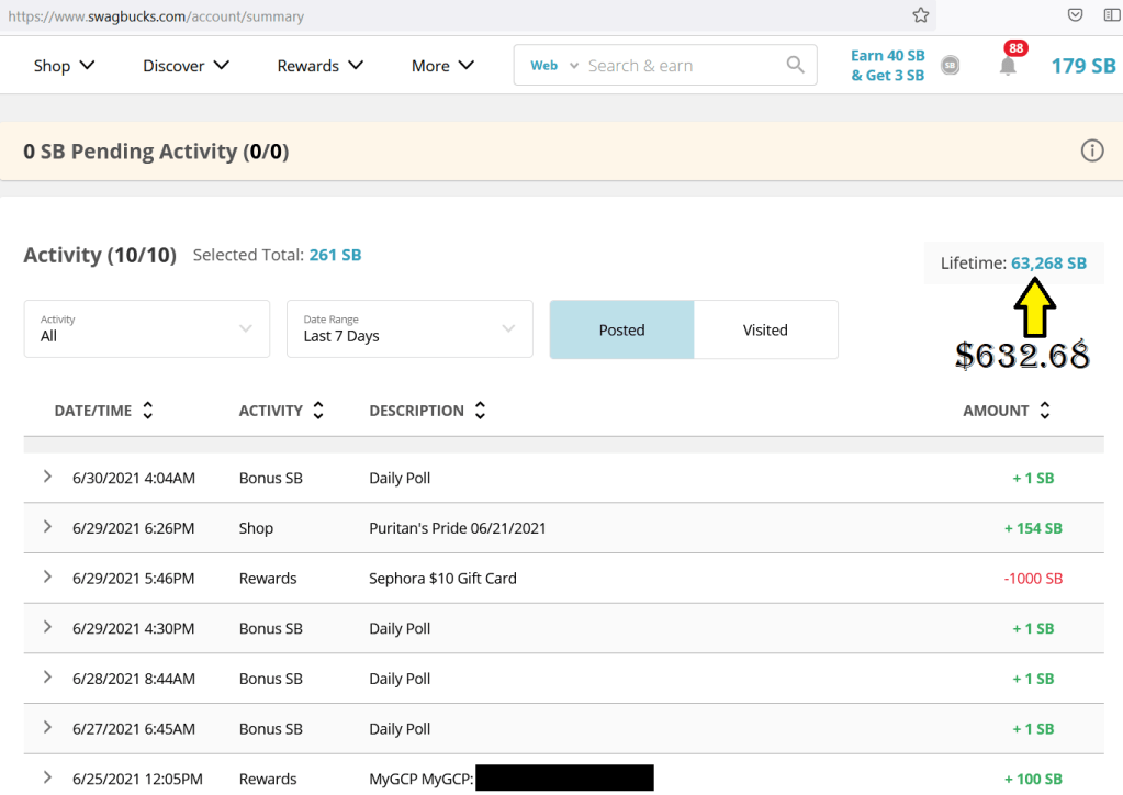 Swagbucks works like Rakuten regarding the cashback process of making a purchase through an activated link and getting credit for it. However, Swagbucks only pays in the form of gift cards, not cash, though a PayPal gift card is also an option. Everything is listed in SB. Every 100 SB is worth $1, and I can claim a gift card technically at any time, but gift card redemptions start at $5 or more, depending on which one I try to get. It can also take minutes to several days for the gift card link to be emailed, though it’s usually a day or two.