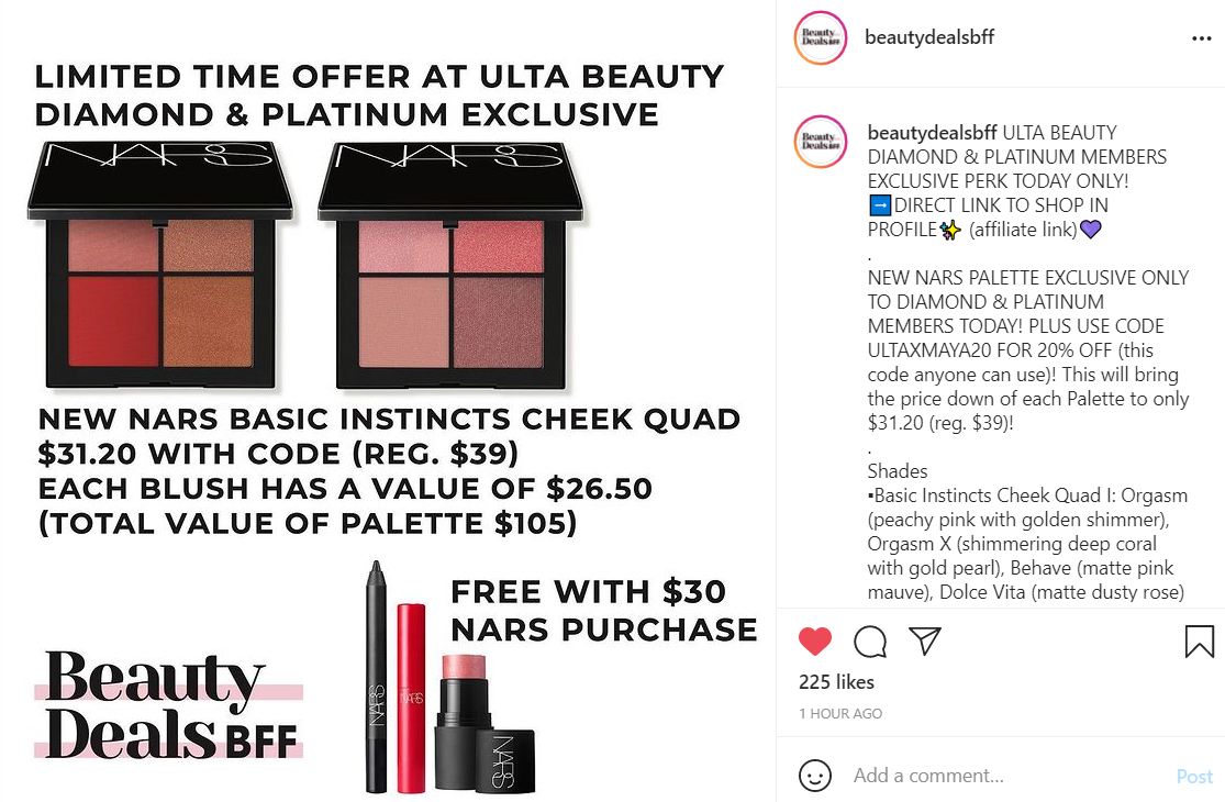Another more recent example of utilizing a combination of money savings and perks of reward programs is when BeautyDealsBFF posted about the Nars Cheek Quad that was released early for Platinum and Diamond Tier Members at Ulta. There was a 20% off influencer promo code going on that would bring it down to nearly the same price as a single blush (which I almost purchased the day before). Each blush in the quad is nearly the same size as a full-size pan too. All four shades in the quad were colors I debated purchasing at one time or another, so I jumped on the opportunity.