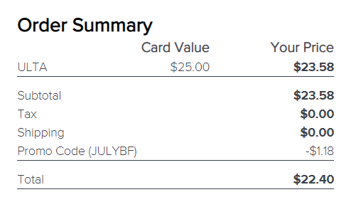 First, I went to Raise and saw they had a “Black Friday in July” 5% savings bonus using the code JULYBF. So I paid $22.40 to get a $25 Ulta gift card.