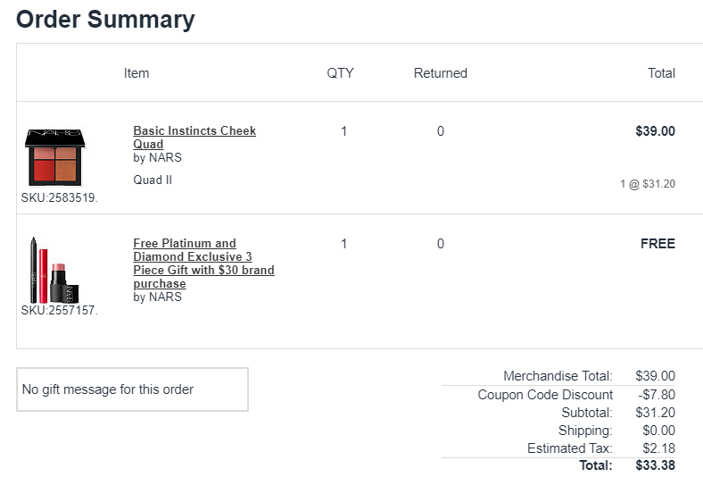 Then I went to Ulta and added the items to my cart (including the current Ulta Nars Free Gift with Purchase).