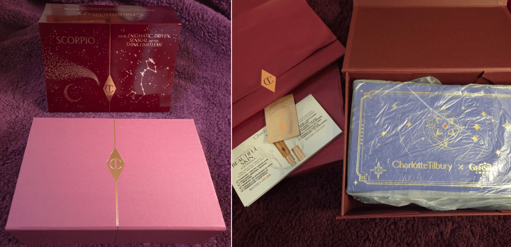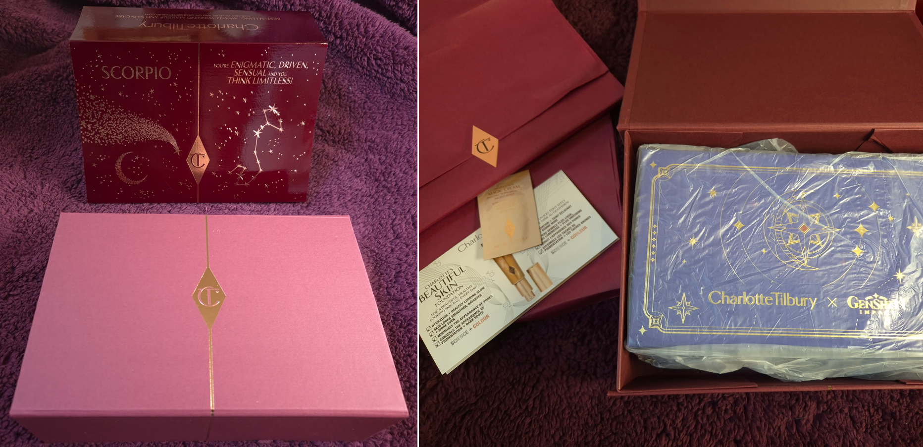 I wanted to have the full experience ordering from the website, so I paid a little extra to get the Large Gift Box. It’s a nice box, although it doesn’t have the soft touch coating. There was an option to choose a ribbon or a sleeve to go around it. I picked the Scorpio Sleeve (another tie to Charlotte’s love of constellations and the cosmos). I also received my two free gift with purchase samples. Shipping was free (normally under 4 Euros if the minimum purchase subtotal hasn’t been reached) and I was able to use the welcome code (Darling15) to save 15% off my order!