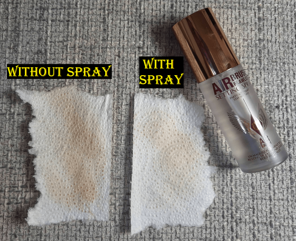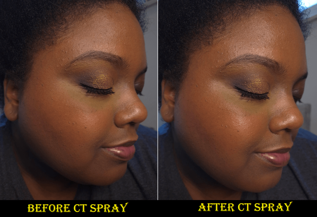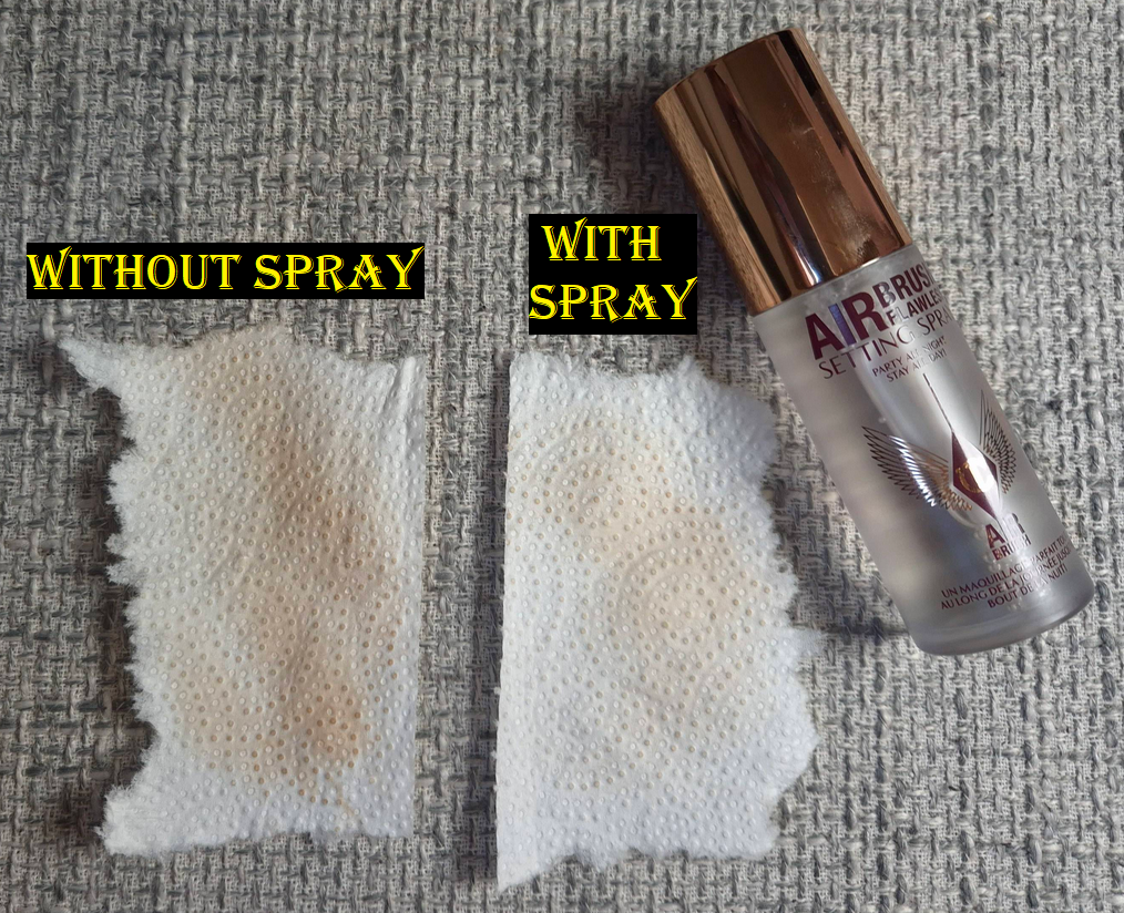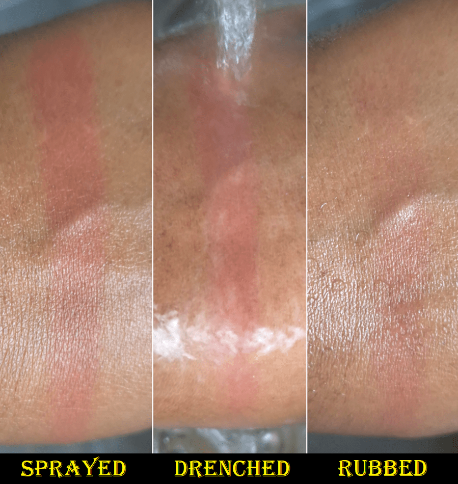 The photo above shows the amount of foundation that transferred onto the paper towel pieces after I pressed it against different parts of my face. It was a warm-ish sunny day when I’d gone out, so I sweat a bit. On the half of my face that I used the Charlotte Tilbury setting spray on, it clearly had less transfer. Based on the website description, I couldn’t find any transfer claims other than promising this will “lock in” makeup. However, the brand says this is waterproof. I did a test using the Rare Beauty Bouncy Blush on the back of my hand and sprayed it with the CT Spray, giving it ample time to dry. Then, I ran it under water for some time. The swatch was completely unaffected. I know the rule of thumb is to not rub one’s face if using waterproof products and just let the water slide off. I was still curious and rubbed the swatch hard while there was still water present. I was surprised to see how much of the swatch was still visible. As far as testing the waterproof claims on my actual face, the most I can say is that I spilled a little water on my chin while I was drinking and it didn’t leave any streaks. So, as far as I’m concerned, this appears to actually have waterproof capabilities, though I haven’t done intense additional tests.