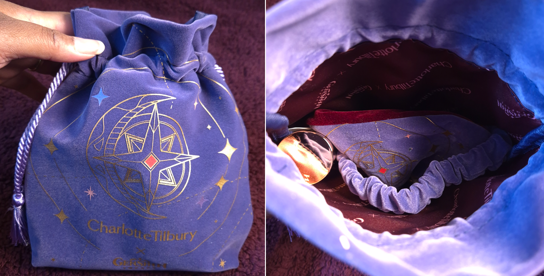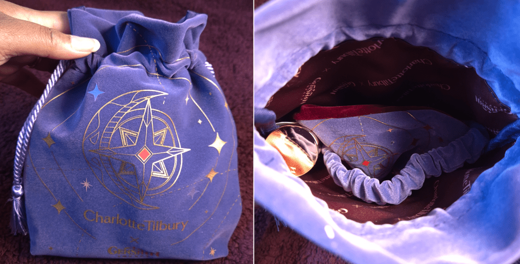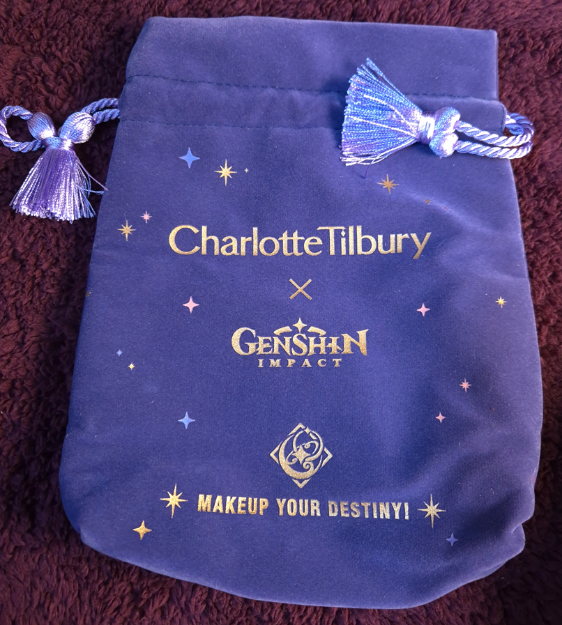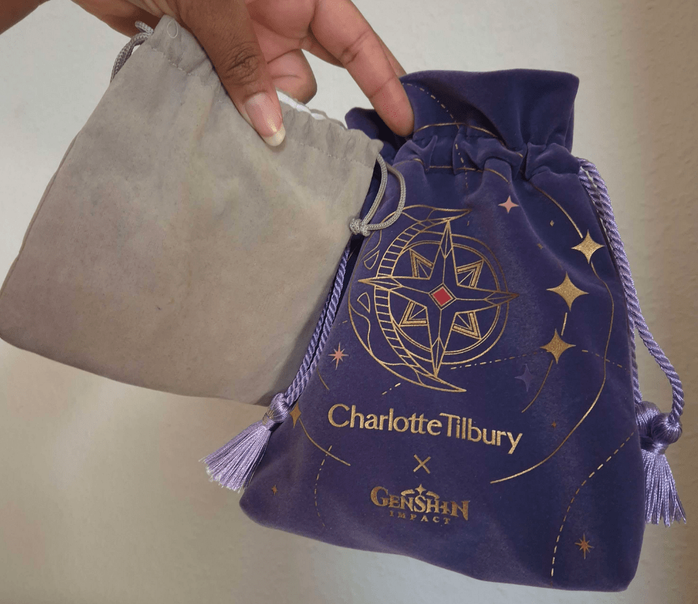 The bordeaux colored inner lining is polyester with both Charlotte Tilbury and Genshin Impact logos. I don’t know the technical term for the kind of printing that’s on the outside in the gold design, but I can feel it on the fabric.