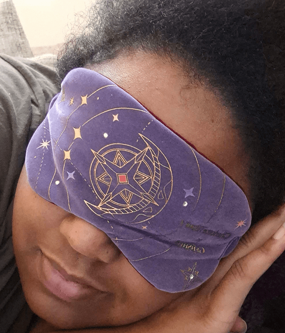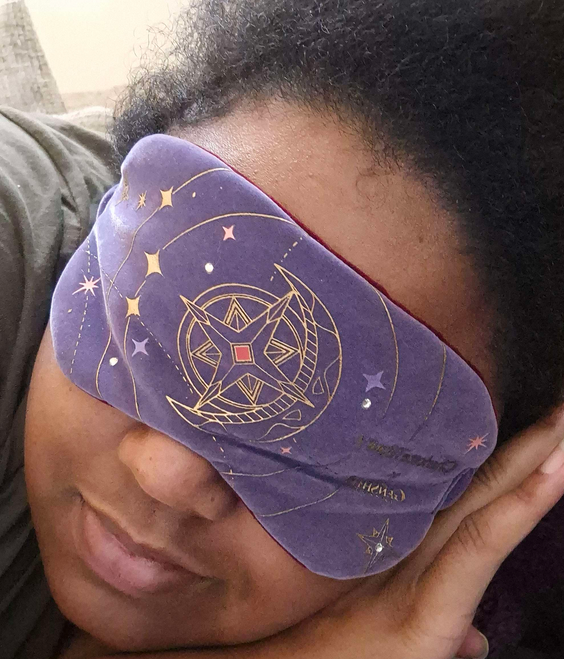 The underside of the mask has the same gold patterns and letters, which means I can feel that it’s scratchy when I run my fingertips over it. I was concerned that I would feel it against my eyelids and face while I wore it, but it wasn’t an issue. To be fair, I haven’t been able to wear it long enough to confirm if laying down with it while tossing and turning would pose an issue.