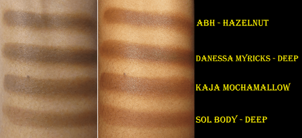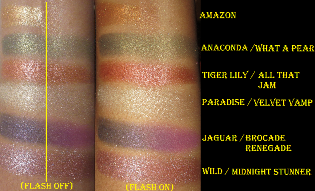 In the photo above, in the “Flash Off” set of swatches, I put a yellow divider line to help show the differences between the Flower Beauty swatches on the left half and the MAC swatches on the right half. In the “Flash On” set of swatches, I did not put a divider in order to keep it from impeding on seeing how similar the two sets look next to each other in every shade except Amazon (which had no equivalent) and Jaguar.