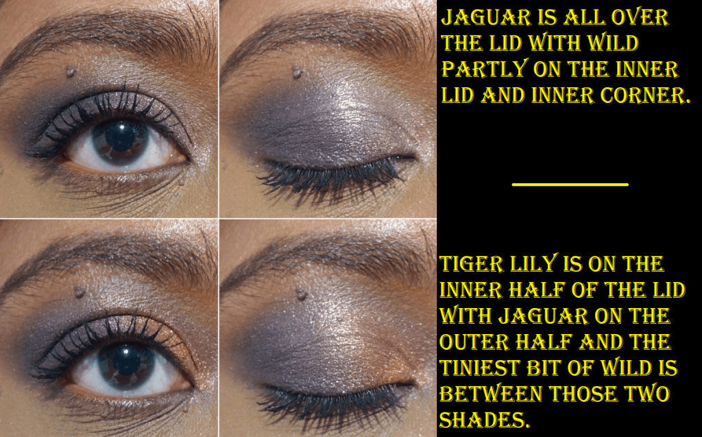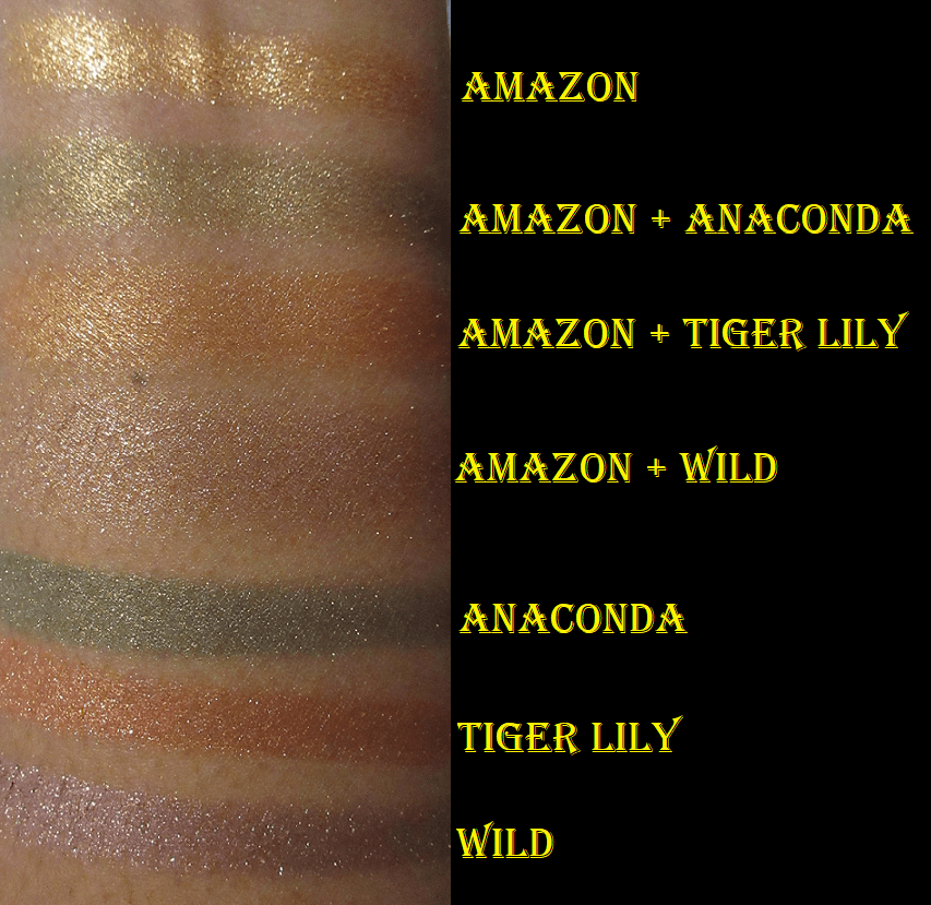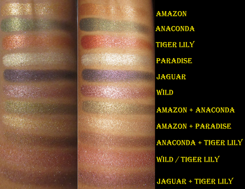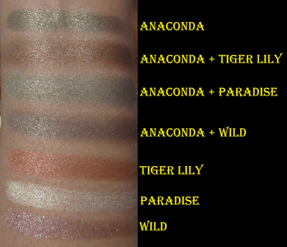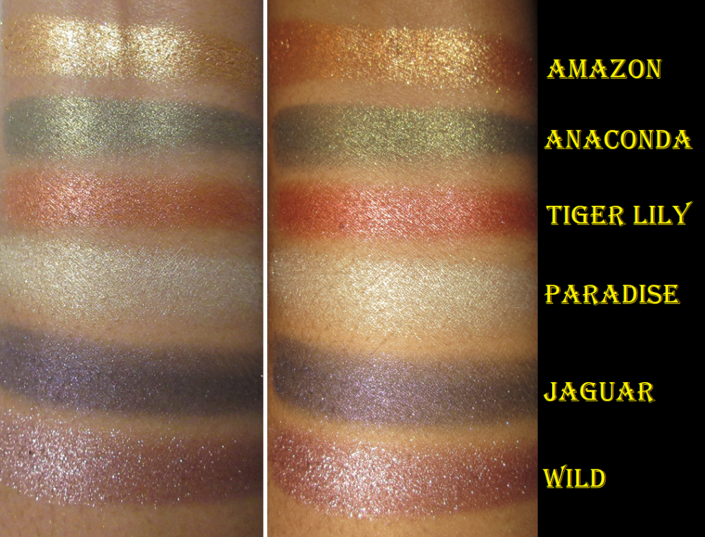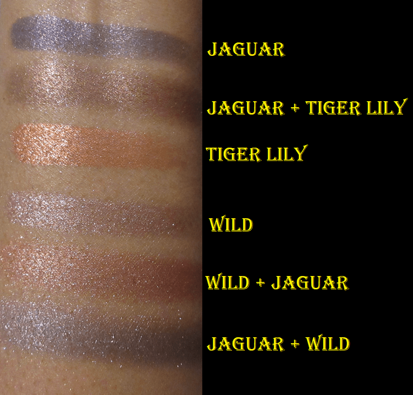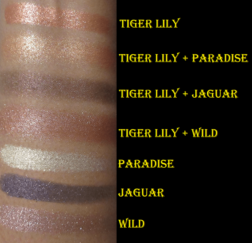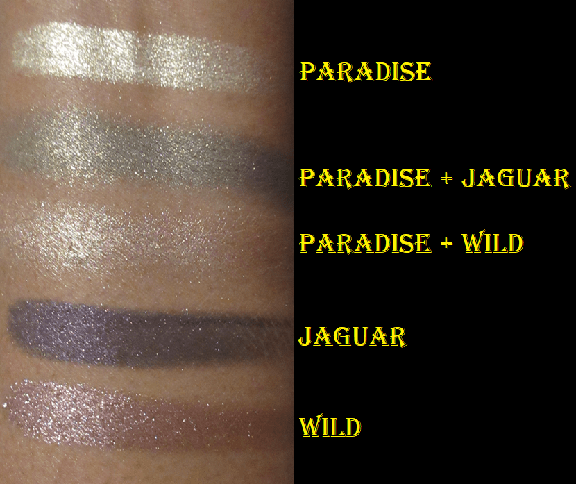The Flower Beauty Jungle Lights formula is as creamy as everyone says, except Paradise and Jaguar have less slip and feel a tad more gritty. I also like the sparkle and shine level of these shimmers, which clearly surpass that of the MAC Feast Your Eyes Palette from the Tempting Fate Collection.
