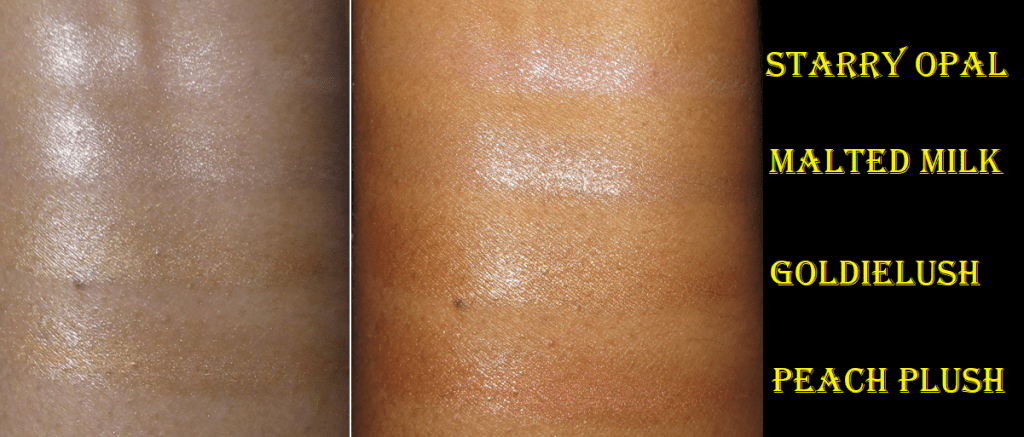 They look nearly identical in photos, but the slight pink tinge in Starry Opal, the light silvery tone of Malted Milk, the traditional medium gold in GoldieLush, and the orange tint to Peach Plush are identifiable in person.