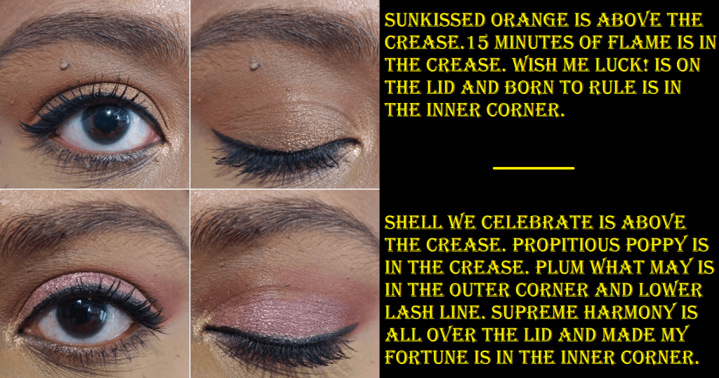 This palette was a gift from one of my best friends, and for that reason I will cherish it. It’s one of those things I wanted for the packaging, but not the makeup inside, since I tend to not be the biggest fan of MAC’s eyeshadows. I can at least say the quality of this one is the best I’ve tried from them. The shimmers have pigmented bases, but are a bit tame in sparkle reflectivity, even when used wet. I appreciate that they were easy to apply smoothly to the lids and inner corner. The mattes were also more pigmented than I expected from MAC, and slightly easier to blend than the ones I’ve used in the past. Creating the two looks shown below was enjoyable enough that I may continue to use this palette from time to time, but not enough to make me want to purchase anymore MAC shadows. There isn’t a whole lot of versatility among the two light mattes that hardly show on me (Shell We Celebrate and Sunkissed Orange) and two shades that look nearly identical when used next to each other (Propitious Poppy and Plum What May). The shimmers (excluding Supreme Harmony) don’t look that far off from each other in the pan, but I was pleased to see they are distinctly different on the eyes. Wish Me Luck!, 15 Minutes of Flame, and Born to Rule (as a highlight shade only) are my favorite eyeshadows in the palette. I’ve really been into the brown shimmer eyelid look lately. I still feel $32 is a bit pricey for the quality, so for anyone wanting this palette, I hope you’ll be able to get it on sale!