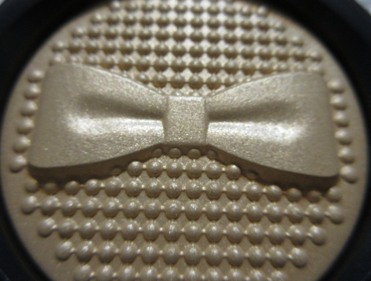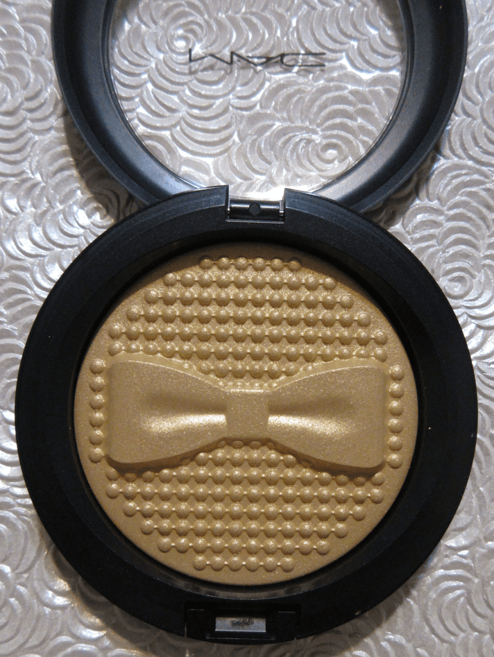 The highlighter embossing encapsulates the “Bubbles and Bows” theme MAC chose for holiday 2022. MAC Highlighters tend to be smooth to the touch, but even when I rub my finger across the smoother part of the bow, it feels slightly rough and dry. However, it has such a healthy glowy sheen with a few twinkling sparkles that are just enough for me to feel like this is a festive highlighter I would want to wear to a holiday event, and not enough to be considered glittery. This contains medium size sparkles instead of large ones, which is probably why I actually find them to be quite pretty and wearable.
