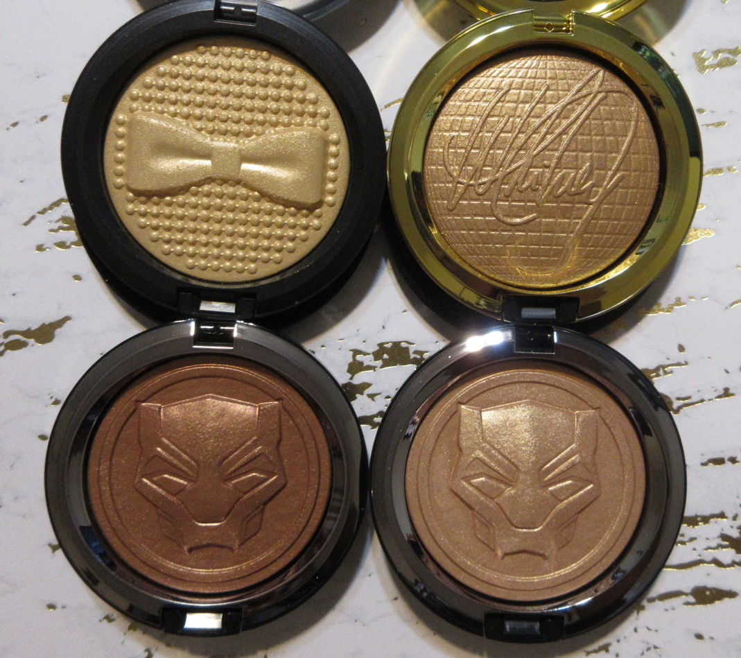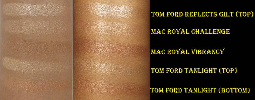 At the same time that I purchased these two, I also bought the Tom Ford Shade Illuminate Highlighting Duo in Tanlight that reminded me of a combination of those shades. However, in swatching them together, I see that the tones are slightly different. The lighter shade in Tanlight is more flattering on me than Royal Challenge and the deeper shade is not as dark, and therefore works on its own for me better than Royal Vibrancy. Most of the time I just mix the two Tanlight shades together for a highlighter shade I love a lot and it’s in an even smoother finish than the ones from MAC. Considering I paid around the same price for Tanlight (it was slightly discounted at Nordstrom) as the two MAC highlighters combined, it’s funny that the Tom Ford one was the better purchase for me. However, I also bought these as Black Panther/Wakanda Forever merchandise, so I don’t regret it.