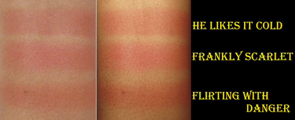 This color makes me think of MAC’s Flirting with Danger and Frankly Scarlet blush shades. I’ve tried several times to capture the variations in undertone, but they barely show a difference on my skin tone. I retook the photos again, but had to do brush swatches because my older powder blushes from MAC really don’t like to be finger swatched anymore. Nikki, who I’ve mentioned several times here, did a clear comparison of those three shades that can be found here on her blog for those interested, as well as a ton of other MAC content and more. Essentially, the undertone of those shades are going to make a bigger difference if you’re lighter than me (and then perhaps on the other end of the spectrum, if you’re much deeper).