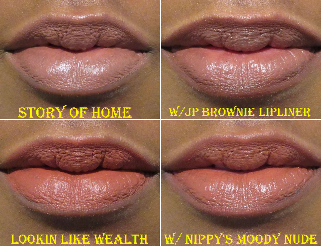 To me, this color is a muted yellow-brown. However, sometimes I could swear it looks a bit olive or that it leans a stronger grey depending on the lighting. How we perceive color is in relation to other colors, so sometimes I think Hodge Podge looks good when I have no other makeup on versus my foundations that tend to lean even warmer. The tones and depth of this shade is like a desaturated version of my skin, so it doesn’t look like full on concealer-lips/foundation-lips, but I don’t feel confident enough to wear this in public without a lip liner. Maybe it’s due to my preference for high contrast looks on myself, and Hodge Podge looks too flat.