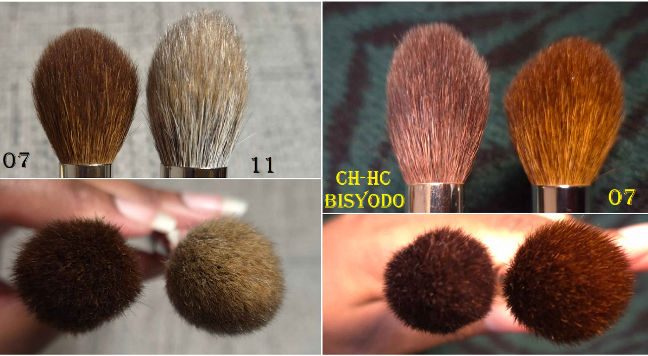 The reason I wanted this brush is because of how much it reminded me of Bisyodo’s CH-HC brush, which has been my holy grail highlighter brush for years. I have a backup brush that I once painted in order to make the handle look prettier, but I wanted to get the one from Number Eight in the hopes that it would perform similarly while having a thicker sturdier handle. It’s also the case that when I bought my first CH-HC it was listed as Saikoho hair, but CDJapan eventually changed the listing to Sokoho. My backup CH-HC felt different and could be Sokoho (albeit the softest Sokoho ever), but I still don’t know if my original is Saikoho or not. This was another reason I didn’t mind getting the 07 brush, so that I could have a Saikoho backup. As it turns out, they are shaped differently. Bisyodo’s brush head comes to a longer pointier tapered tip. It’s much more of a candle shape. The 07 reminds me of the shape of my Hakuhodo 5521, but in a dyed saikoho version instead of my original blue squirrel goat mix. The brush had also grown wider over time and was never as pointed as it looks in website photos.
