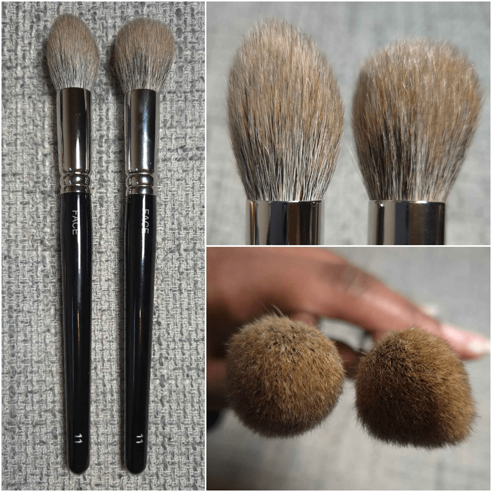 In the photo below, my official Face 11 is on the left and is much pointier in shape. My unofficial Face 11 is on the right. I am assuming the reason the unofficial one ended up being sold as an outlet brush is because of the fact that it’s not as candle-shaped as it was supposed to be.