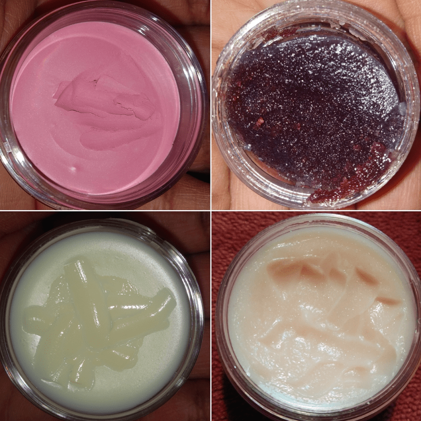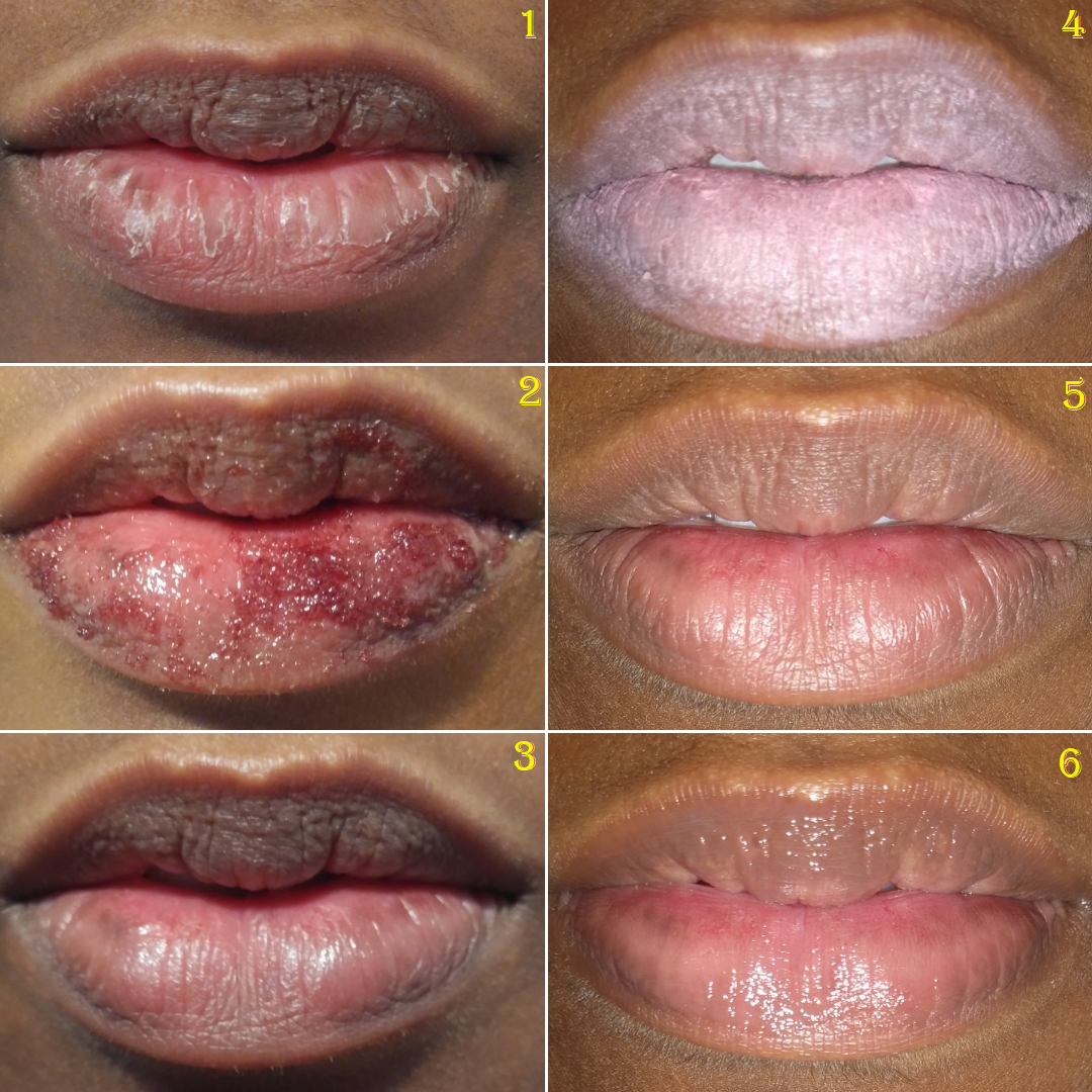 Step 1 shows my lip state beforehand. Step 2 shows my lips with the Red Velvet Scrub on. Step 3 shows the state of my lips post scrub with some chapped bits still there, particularly on the upper lip. Step 4 shows my lips with the sweet clay mask on. Step 5 shows the condition of my lips after leaving the mask on overnight and washing it off. Step 6 shows my lips with the Dream Slip on the lips.