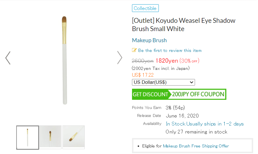 This brush was released June 16th at the discounted price. I assume outlet means it just wasn’t able to sell well, so CDJapan got ahold of some stock at a cheaper price the way some mid to high-end makeup brands end up at TJMaxx? The alternative meaning is if “outlet” products have a cosmetic flaw, but something like that would normally be noted on the website, so I believe it’s the former.