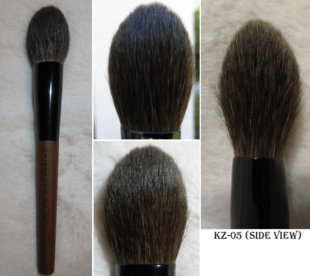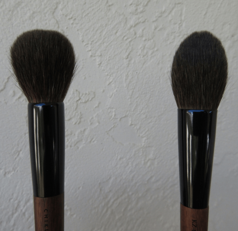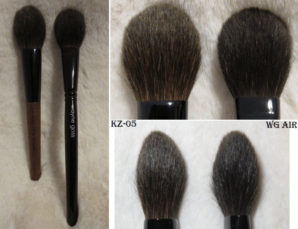 Upon first glance, the brush head size reminded me of the Wayne Goss Air Brush. That brush is made of blue squirrel for $35 versus Kazan squirrel for $90. The Air Brush is a few millimeters smaller in length and width, but when I squished the bristles, the Air Brush is about half as dense as the KZ-05. If the Air Brush was double the density and twice the price, it would still show the large price gap between the two squirrel hair types.