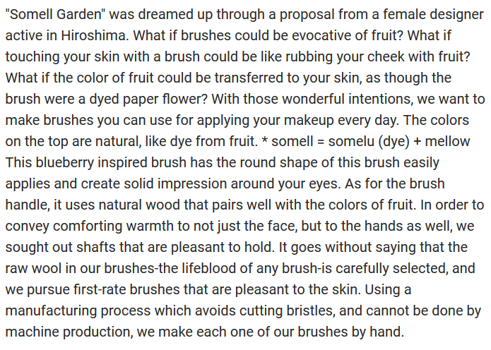 Before I move onto the next brush, I have to show the concept (as sited on FudeJapan and CDJapan) behind the Somell Garden series because it’s pretty fascinating.