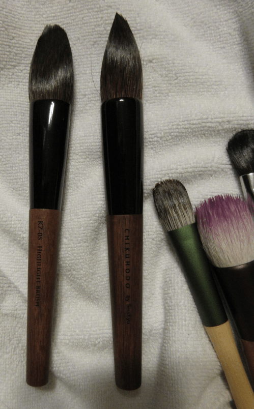 I have a photo of the KZ-05 and KZ-04 while wet after being washed. It shows a better idea of the amount of hair in each brush, and I was shocked to see how much thinner and more tapered the blush brush got than even the highlighter brush!